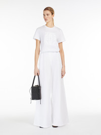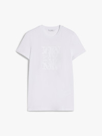 DETAILS Short-sleeved crew-neck T-shirt made of soft cotton in a solid colour. A basic, straight-cut style, embellished with a MaxMarabesque motif embroidered in lurex thread and applied on the front COMPOSITION AND CARE Jersey fabric 100% cotton; - exclusive of embroideries. Machine wash cold delicate cycle; do not bleach; do not tumble dry; flat drying in the shade; cool iron; professionally dry clean perchloroethylene - mild process; professional wet cleaning - very mild process.; iron with a cloth between.; using neutral detergent. Distributed by Max Mara S.r.l., registered office in Reggio Emilia (Italy), Via Giulia Maramotti 4, 42124 (IT)