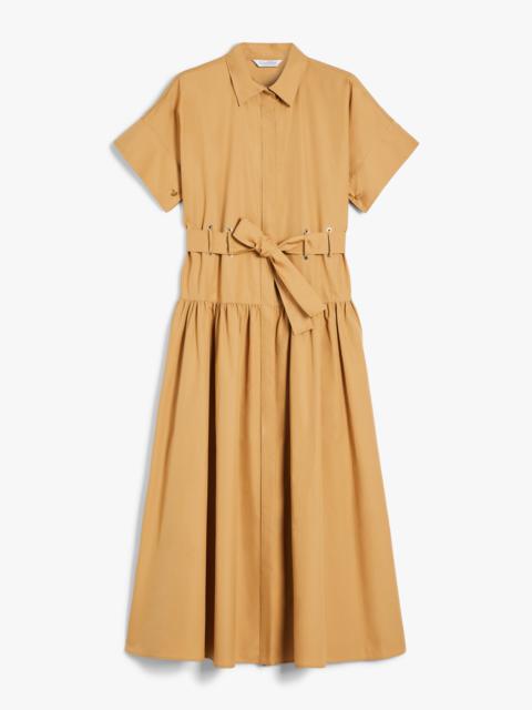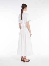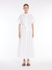 DETAILS Long, pure cotton poplin shirt dress. Flared style featuring a classic shirt collar, short kimono sleeves with a button at the hem, seam at the waist and a matching belt to accentuate the waistline. Finished with a yoke cut and pleat at the back, metal eyelets and a fabric drawstring at the back of the neck. Concealed button fastening at the front that runs the length of the garment. COMPOSITION AND CARE 100% cotton. Machine wash cold delicate cycle; do not bleach; do not tumble dry; line drying in the shade; cool iron; professionally dry clean perchloroethylene - mild process.; do not iron the buttons.; remove the cufflinks before washing.; contains non-textile parts of animal origin. Distributed by Max Mara S.r.l., registered office in Reggio Emilia (Italy), Via Giulia Maramotti 4, 42124 (IT)