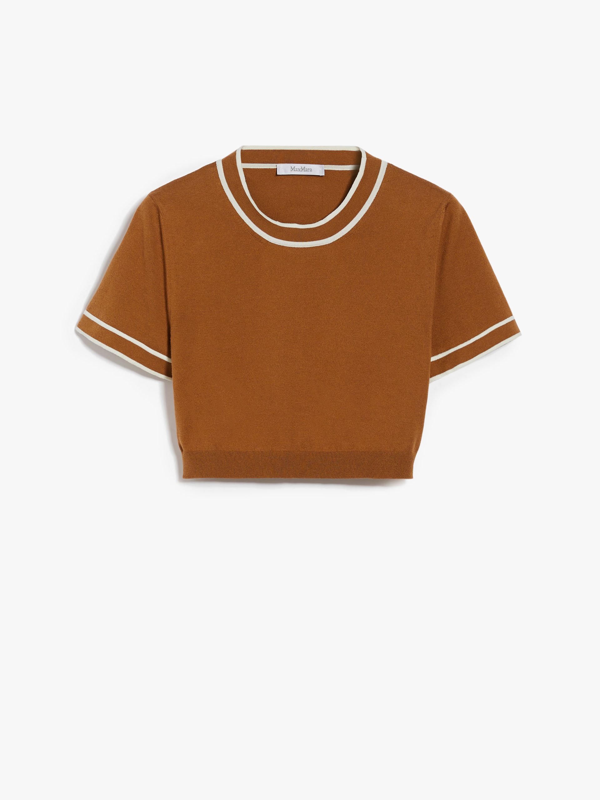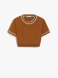 DETAILS Cropped crew-neck jumper in 18-gauge polished cotton yarn. Contrasting edges. COMPOSITION AND CARE Knitted fabric 80% cotton, 20% polyester; - exclusive of decoration. Hand wash cold; do not bleach; do not tumble dry; flat drying in the shade; cool iron; do not dry clean; do not wet clean.; iron with a cloth between.; using neutral detergent. Distributed by Max Mara S.r.l., registered office in Reggio Emilia (Italy), Via Giulia Maramotti 4, 42124 (IT)