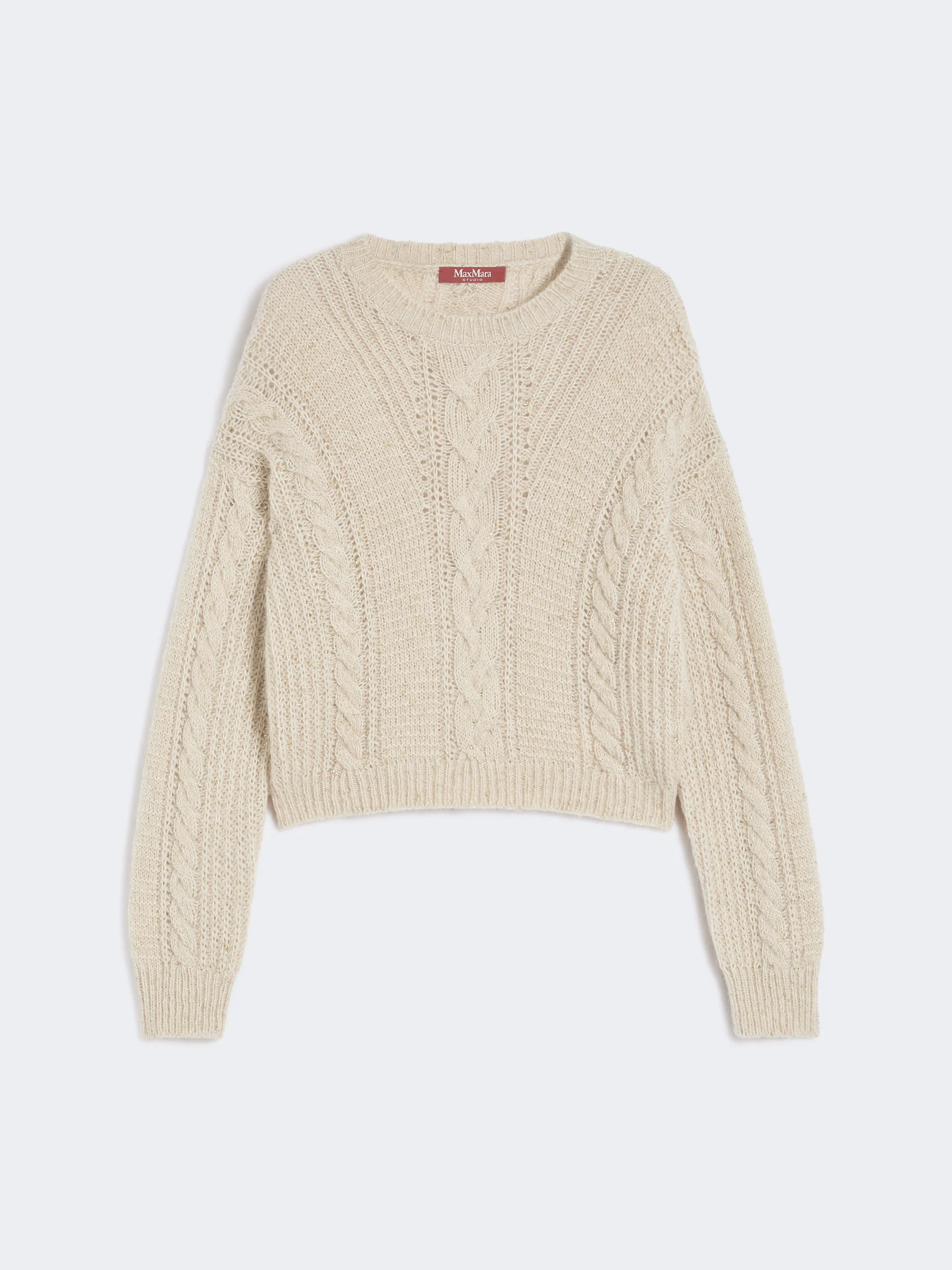 DETAILS Cropped sweater with boxy silhouette, knitted with a combination of textured stitches and all-over cable patterns. The yarn is enriched with metallic fibres, adding luminosity and character. Alpaca-blend yarn sweater Boxy fit Crew neck Long sleeves with dropped shoulders Rib-knit trims and straight hem COMPOSITION AND CARE 55% polyamide, 39% alpaca, 6% metallised fiber. Hand wash cold (40°c max); do not bleach; do not tumble dry; flat drying in the shade; cool iron; professionally dry clean perchloroethylene - mild process; do not wet clean.; iron with a cloth between.; using neutral detergent. Distributed by Max Mara S.r.l., registered office in Reggio Emilia (Italy), Via Giulia Maramotti 4, 42124 (IT)