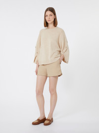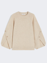 DETAILS Slightly oversized sweater featuring crossover detail and branded horn buttons on the sleeves. Stockinette-stitched wool and cashmere yarn sweater Crew neckline Loose-fitting raglan sleeves Branded horn plate on the back of the neck Ribbed hems COMPOSITION AND CARE 70% wool, 30% cashmere. Hand wash cold (40°c max); do not bleach; do not tumble dry; flat drying in the shade; cool iron; professionally dry clean perchloroethylene - mild process; do not wet clean.; iron with a cloth between.; using neutral detergent. Distributed by Max Mara S.r.l., registered office in Reggio Emilia (Italy), Via Giulia Maramotti 4, 42124 (IT)