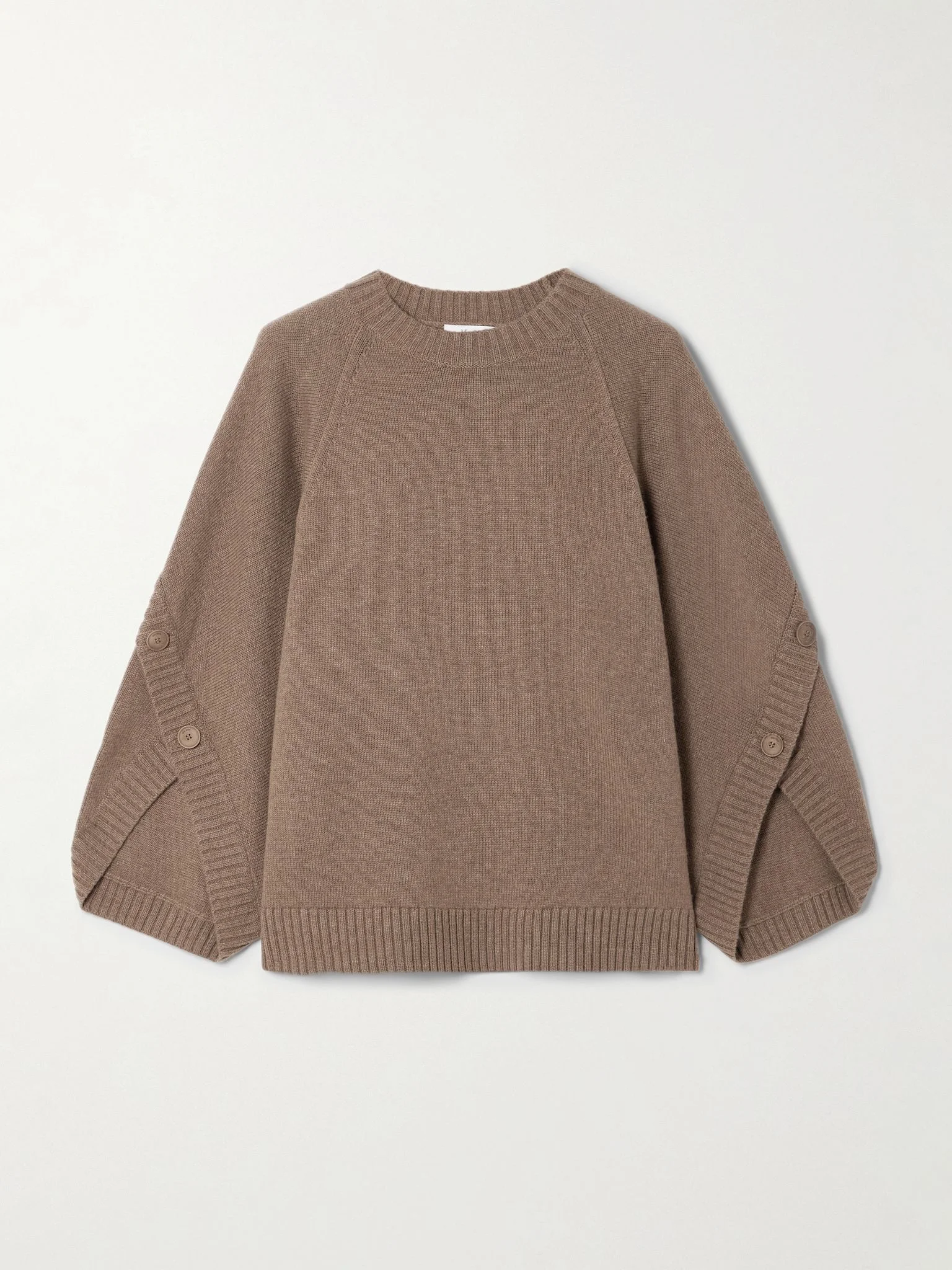 Max Mara's 'Ampex' sweater is designed with oversized sleeves that can be adjusted by the tonal buttons to change their shape. It's made from a cozy wool and cashmere-blend and has a relaxed fit defined by ribbed trims. Details & Care - Light-brown wool and cashmere-blend - Slips on - 70% wool, 30% cashmere - Hand wash or dry clean - Designer color: Hazelnut