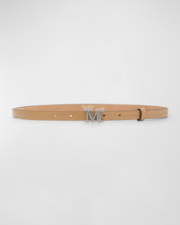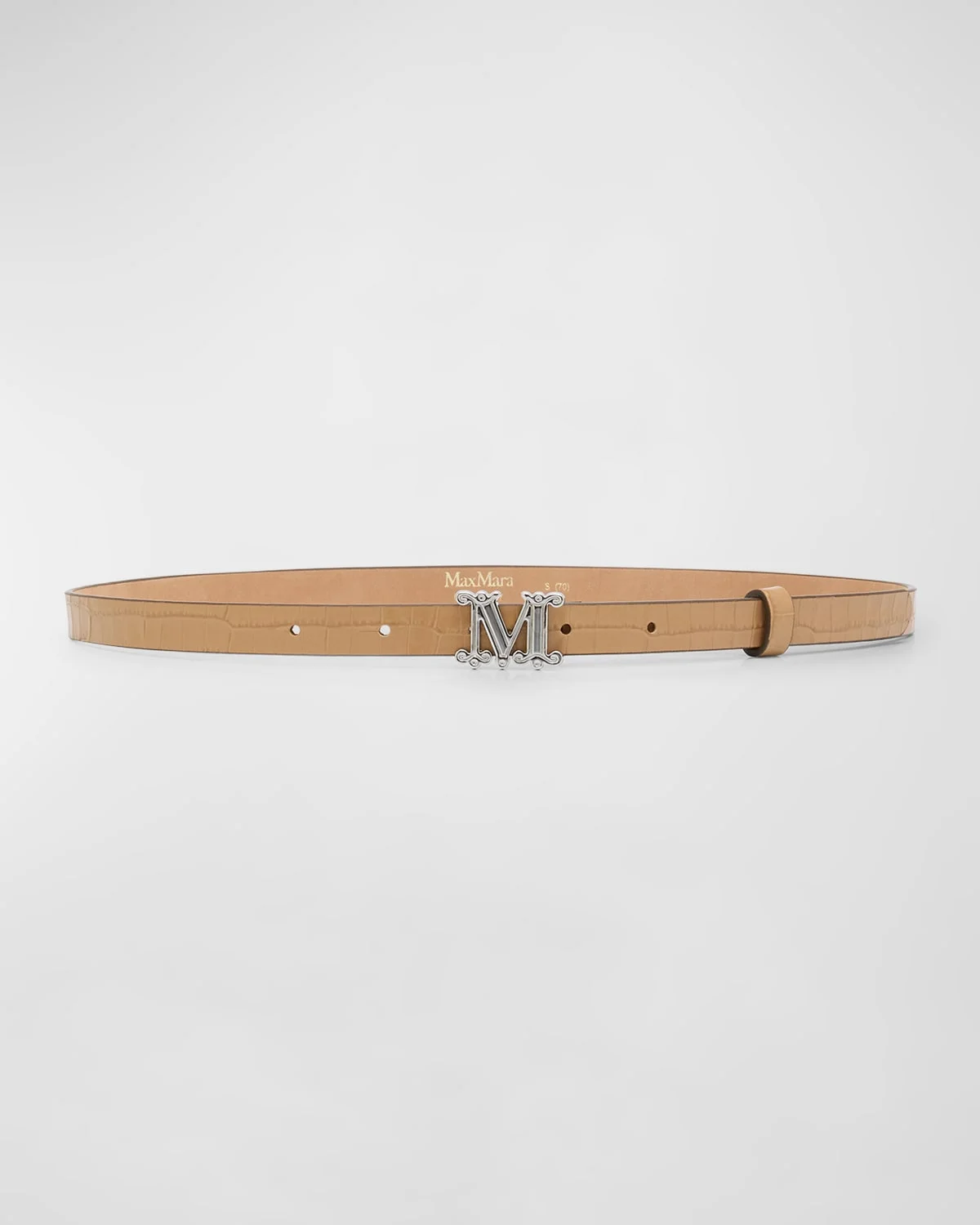 - Max Mara croc-embossed skinny belt in calf leather - Features silver-tone hardware - Approx. 0.6"W - Cut to size - Adjustable fit - Monogram buckle - Matching belt loop - Made in Italy