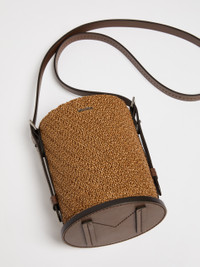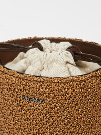 DETAILS Archetipo bucket bag made of raffia-effect crochet fabric, featuring a new cylinder shape with thick leather base and embossed M Monogram. The single handle and the long removable shoulder strap allow it to be carried by hand and worn on the shoulder or crossbody. Finished with a tailor’s pick stitch and leather details, in a soft and naturally smooth calfskin. Interior lined in salt-and-pepper cotton fabric, with open pockets trimmed in leather, a classic drawstring closure and metallic Max Mara lettering applied on the front. Measurements: 20 x 7.5 x 20 cm. COMPOSITION AND CARE Handbag in 100% nylon; with details in calf; lining in 85 cotton, 15 polyester. Distributed by Max Mara S.r.l., registered office in Reggio Emilia (Italy), Via Giulia Maramotti 4, 42124 (IT)
