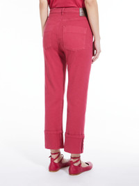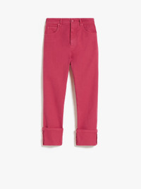 DETAILS Cropped five-pocket jeans made of garment-dyed, resistant, stretch cotton bull. The semi-fitted silhouette features a wide turn-up and stitched leg hem. Finished with logo patch on the back of the waist, matching rivets and buttons. Concealed zip and tack button fastening. Length: 94 cm. COMPOSITION AND CARE 99% cotton, 1% elastane. Machine wash cold delicate cycle; do not bleach; do not tumble dry; line drying in the shade; cool iron; do not dry clean.; wash the garment while it is fastened.; wash separately.; don’t iron the labels.; do not iron the buttons.; protect the metal parts before washing.; turn the articles inside out before washing.; this item may leave colour stains on brightly-coloured garments.; contains non-textile parts of animal origin. Distributed by Max Mara S.r.l., registered office in Reggio Emilia (Italy), Via Giulia Maramotti 4, 42124 (IT)