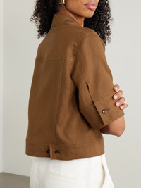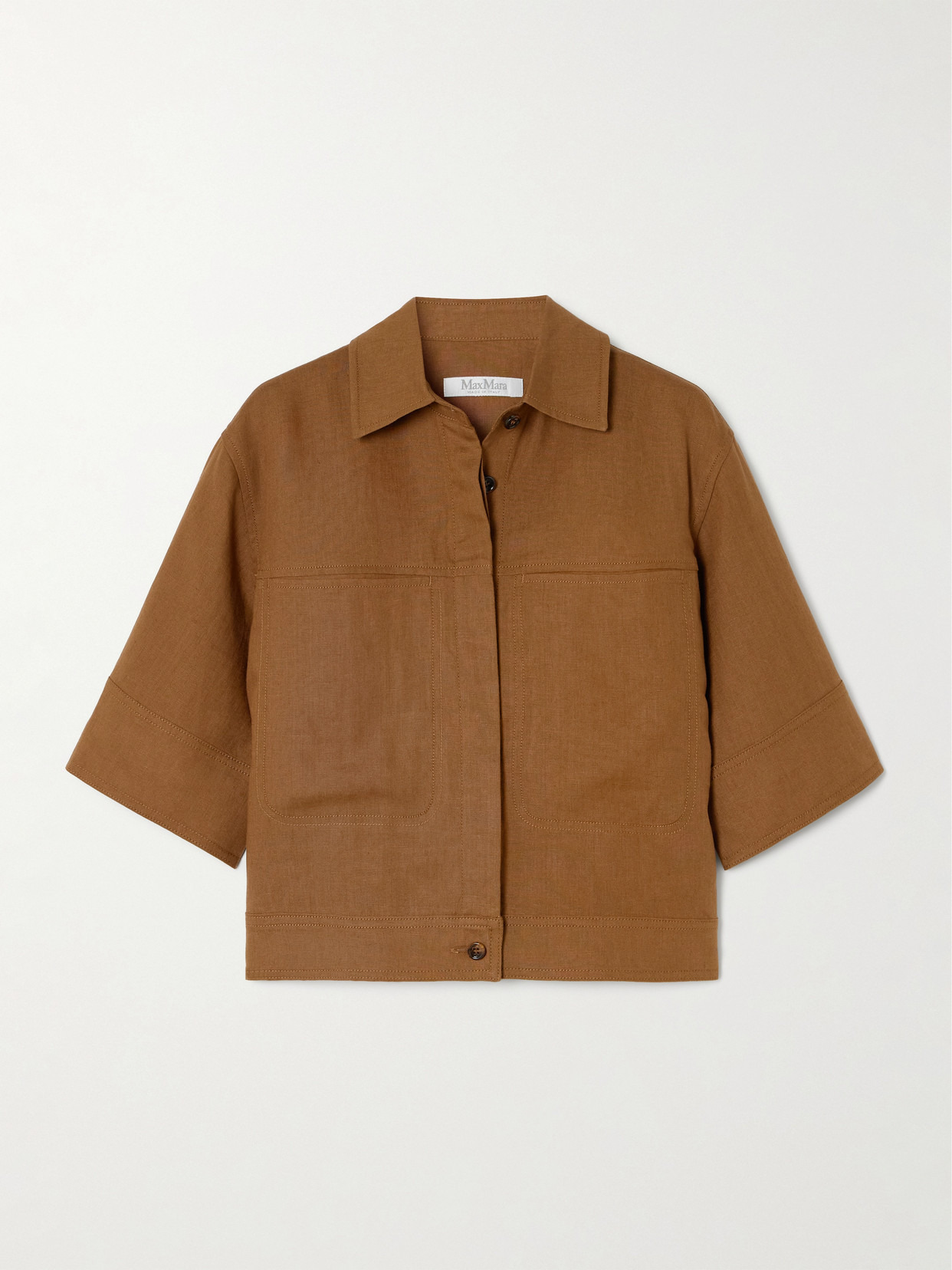 Inspired by classic safari styles, Max Mara's 'Rito' shirt has enlarged chest patch pockets and half sleeves. It's tailored from lightweight linen with a concealed placket and two visible tortoiseshell button at either end. Complement the 'Tobacco' shade with gold jewelry.