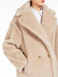 DETAILS Iconic Teddy coat in alpaca and wool on a silk base, available in a new short, above-the-knee length version. The classic style’s oversized fit and details are repeated: large lapel collar, low-set sleeves and vertical welt pockets. Double-breasted style, closed with visible buttons. It is customised with a silk twill logo lining with a floral embroidery on the centre back. COMPOSITION AND CARE Jersey fabric 62% alpaca, 26% virgin wool, 12% silk; lining 100% silk. Do not wash; do not bleach; do not tumble dry; do not iron; professionally dry clean perchloroethylene - mild process; do not wet clean.; protect buttons before washing.; turn the articles inside out before washing.; contains non-textile parts of animal origin. Distributed by Max Mara S.r.l., registered office in Reggio Emilia (Italy), Via Giulia Maramotti 4, 42124 (IT)