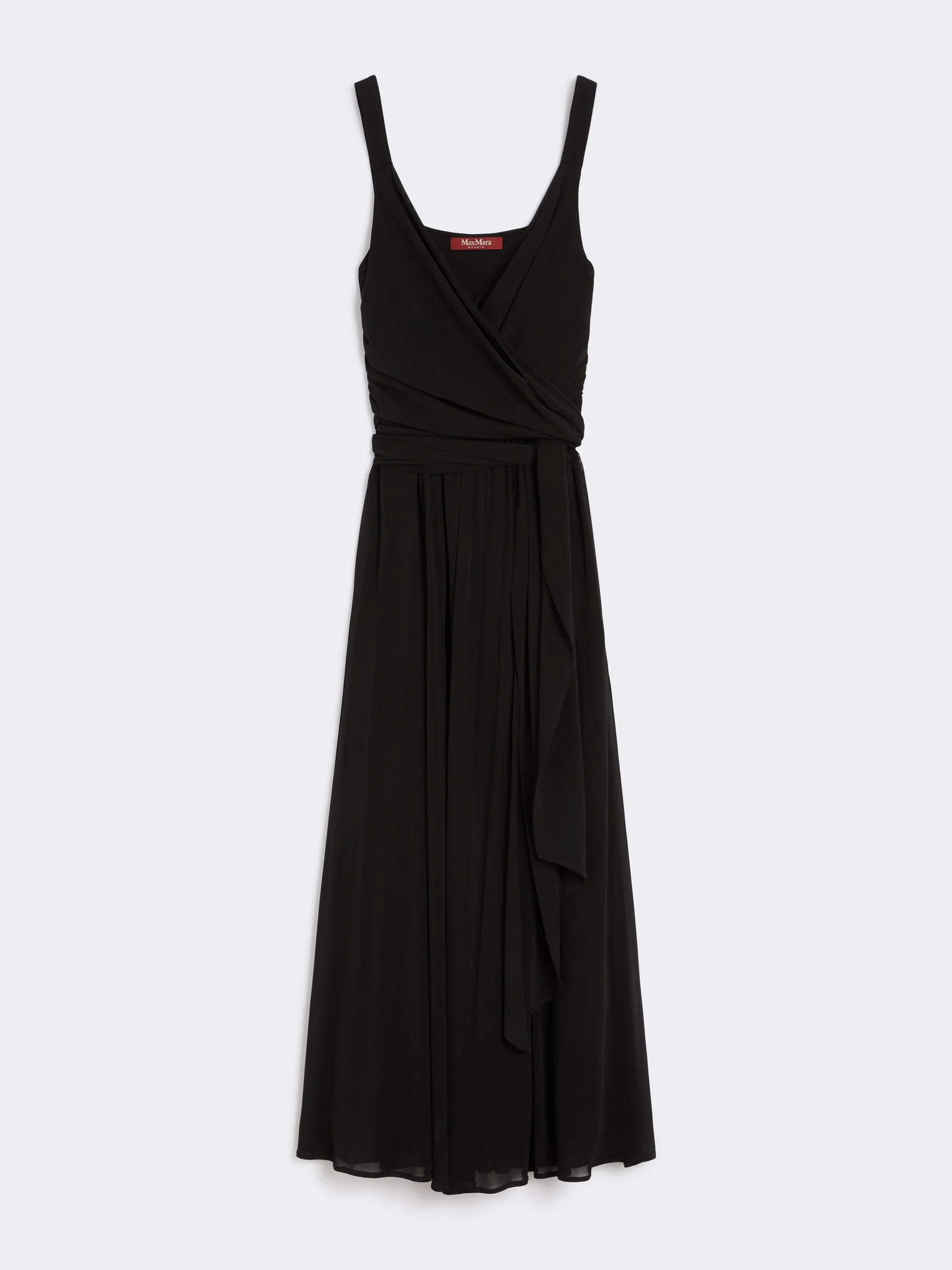 DETAILS Long dress with draped bodice that wraps around the waist and ties at the back. Lightweight viscose jersey dress Flared at the hem Crossed V neck Sleeveless Wide skirt with elasticated waist seam Gathered motif on the front and back COMPOSITION AND CARE Jersey fabric 100% viscose; bottom part lining 100% polyester. Do not wash; do not bleach; do not tumble dry; cool iron; professionally dry clean perchloroethylene - mild process; do not wet clean.; iron with a cloth between. Distributed by Max Mara S.r.l., registered office in Reggio Emilia (Italy), Via Giulia Maramotti 4, 42124 (IT)