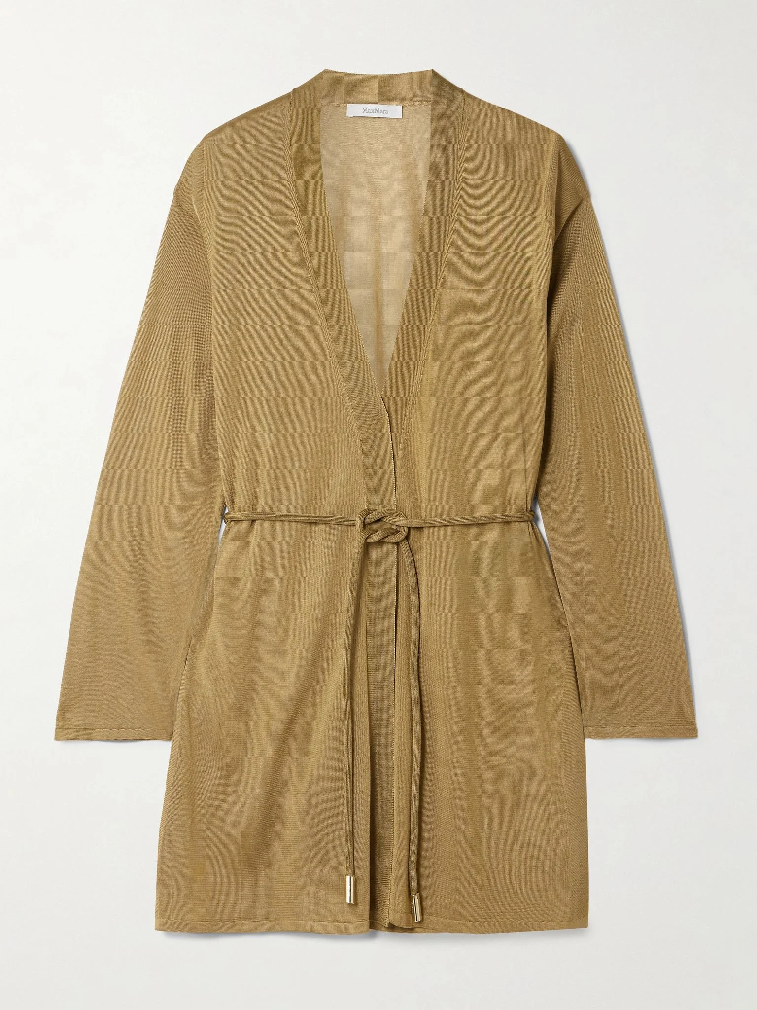 Max Mara's collections are so elegant and sophisticated. This 'Danza' cardigan is finely knitted and cinches at the waist with a tie belt. Wear it with the matching pants. Size & Fit - Fits true to size, take your normal size - Designed for a relaxed fit - Mid-weight knit - Model is 177cm/ 5'10" and is wearing a UK 8 Model measurements: - Bust: 77cm/ 30.5" - Waist: 62cm/ 24.5" - Hip: 88cm/ 34.5" Details & Care - Gold viscose - Slips on - 100% viscose - Dry clean