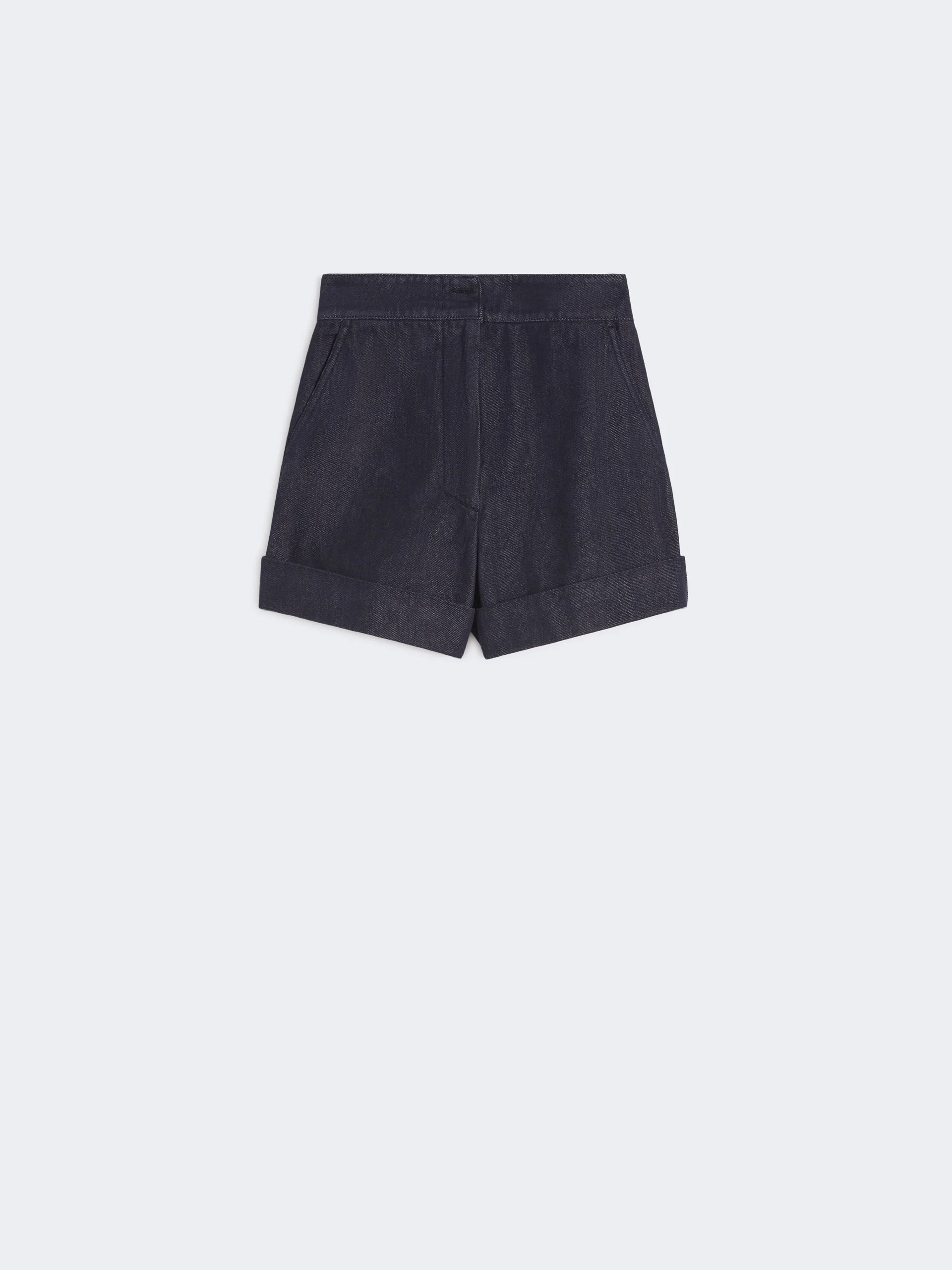 DETAILS High-waisted shorts featuring tonal thread-embroidered Max Mara logo detail on the back of the waist. - Shorts in denim-look yarn-dyed pure cotton fabric - Slightly flared lines with turned-up hem - High-cut waistband with a fly-covered zip and hook-and-bar fastening - Slant side pockets - Welt rear pockets - Sewn darts on the back of the waist COMPOSITION AND CARE Fabric 100% cotton; lining 97% cotton, 3% elastane; - exclusive of embroideries. Machine wash cold delicate cycle; do not bleach; do not tumble dry; line drying in the shade; cool iron; professionally dry clean perchloroethylene - mild process.; put this item into a string bag before washing it.; wash the garment while it is fastened.; protect buttons before washing.; turn the articles inside out before washing. Distributed by Max Mara S.r.l., registered office in Reggio Emilia (Italy), Via Giulia Maramotti 4, 42124 (IT) Collection: Max Mara Product code: 1141026106001 - MXMCALCA