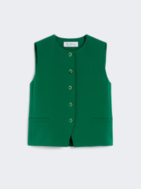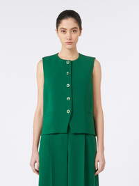 DETAILS Short, mannish waistcoat. - Cady gilet - Straight fit - Crew neckline - Visible 5-button fastening on the front - Horizontal-welt pockets - Lined model COMPOSITION AND CARE Fabric 65% triacetate, 35% polyester; lining 65% acetate, 35% polyester. Do not wash; do not bleach; do not tumble dry; cool iron; professionally dry clean perchloroethylene - mild process; do not wet clean.; protect buttons before washing.; turn the articles inside out before washing. Distributed by Max Mara S.r.l., registered office in Reggio Emilia (Italy), Via Giulia Maramotti 4, 42124 (IT)