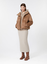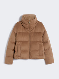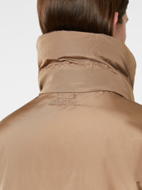 DETAILS Short reversible down jacket with high wrap-around collar and Max Mara logo embroidered inside, on the back of the collar. Pure camel zibeline drap quilted down jacket Interior in water-repellent taffeta with welt pockets Long sleeves with dropped shoulders Full-length front zip fastening Welt pockets with concealed snap buttons Adjustable drawstring at the hem Goose-down padding COMPOSITION AND CARE Fabric 100% camelwool; inner fabric 100% polyester; with quilting virgin goose-down; - exclusive of embroideries. Do not wash; do not bleach; do not tumble dry; cool iron; professionally dry clean perchloroethylene - mild process; do not wet clean.; wash the garment while it is fastened.; don’t iron the labels.; protect the ends stoppers and/or the cord ends before washing.; contains non-textile parts of animal origin. Distributed by Max Mara S.r.l., registered office in Reggio Emilia (Italy), Via Giulia Maramotti 4, 42124 (IT)
