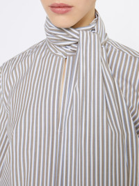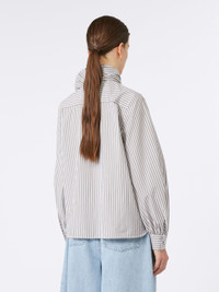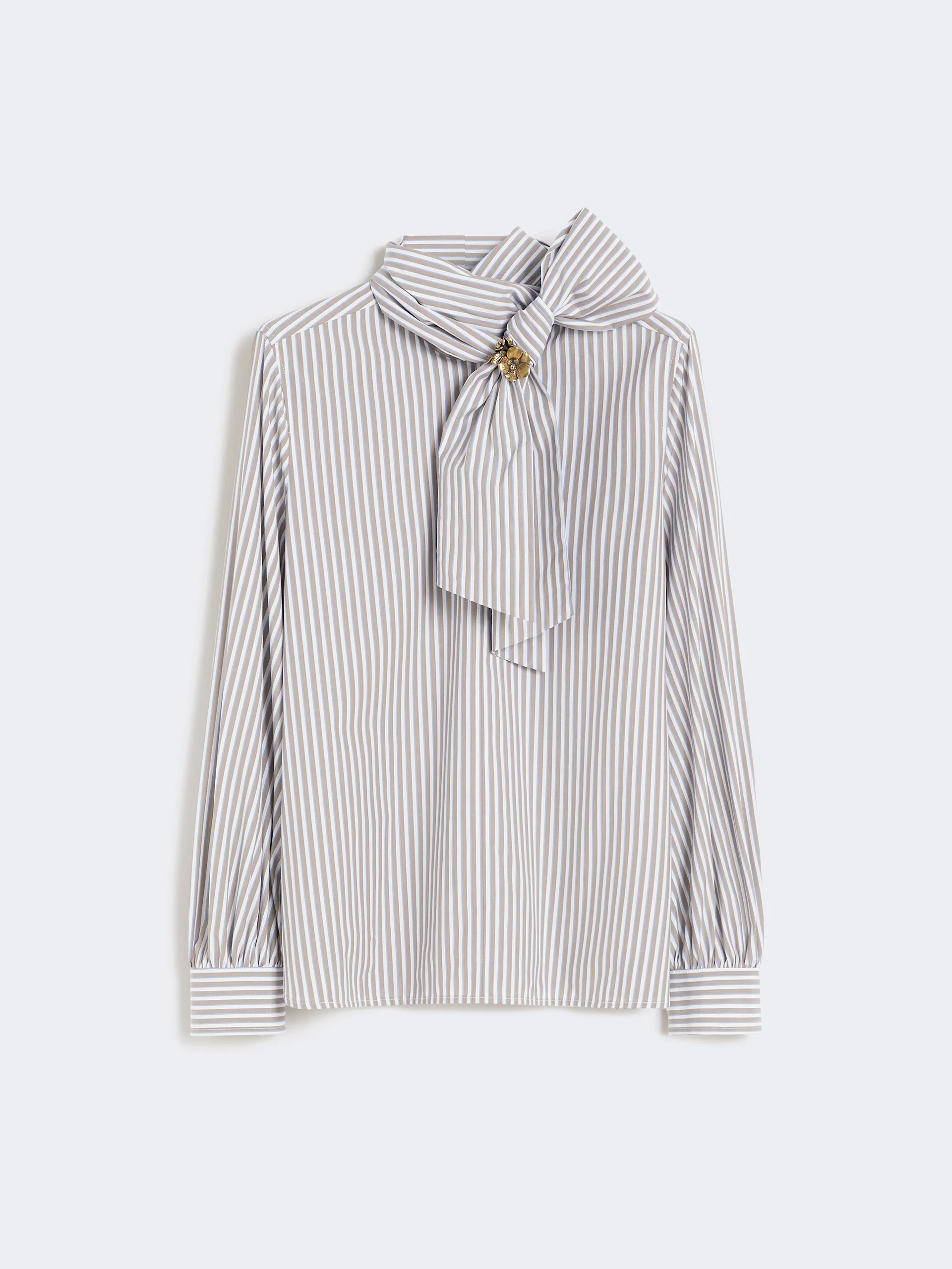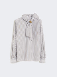 DETAILS Feminine blouse with straight lines, distinguished by long puff sleeves. Blouse in a striped yarn-dyed stretch cotton poplin V-neck and foulard collar that ties in a bow Deep cuffs with covered side button Removable metallic jewel loop Back yoke cut Rounded hem with small side slits COMPOSITION AND CARE 97% cotton, 3% elastane. Machine wash cold delicate cycle; do not bleach; do not tumble dry; line drying in the shade; cool iron; professionally dry clean perchloroethylene - mild process.; do not iron the buttons.; protect buttons before washing.; turn the articles inside out before washing.; remove metal parts before washing. Distributed by Max Mara S.r.l., registered office in Reggio Emilia (Italy), Via Giulia Maramotti 4, 42124 (IT)