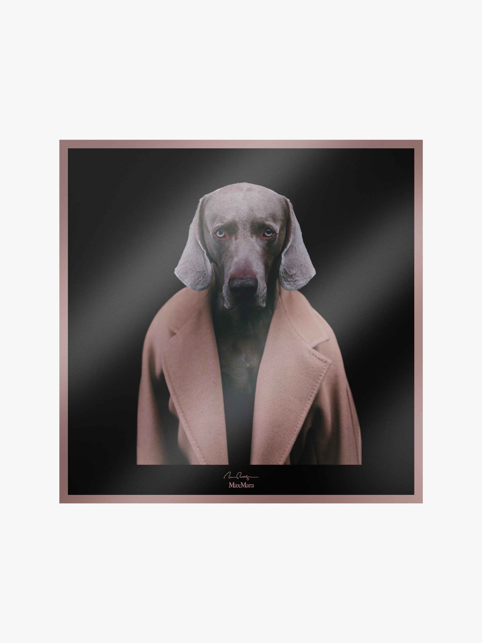 DETAILS Square foulard made of exquisite pure silk twill. Customised with a printed image by the artist William Wegman of his Weimaraner wearing the iconic Max Mara coats. Finished with finely stitched edges. Measurements: 90 x 90 cm. COMPOSITION AND CARE 100% silk. Do not wash; do not bleach; do not tumble dry; cool iron; professionally dry clean perchloroethylene - mild process; do not wet clean. Distributed by Max Mara S.r.l., registered office in Reggio Emilia (Italy), Via Giulia Maramotti 4, 42124 (IT)