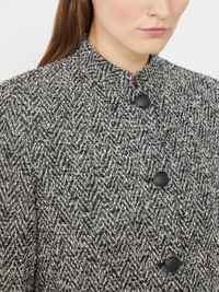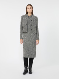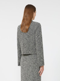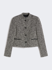 DETAILS Short jacket with a feminine silhouette and leather details. Designed boucle jersey jacket Fitted line Mandarin collar Long, set-in sleeves with small slit at the cuffs Front fastening with metal buttons Horizontal welt pockets at the front Lined in Monogram jacquard fabric COMPOSITION AND CARE Jersey fabric 48% cotton, 37% wool, 10% polyester, 4% polyamide, 1% elastane; lining 65% acetate, 35% polyester. Do not wash; do not bleach; do not tumble dry; cool iron; professionally dry clean perchloroethylene - mild process; do not wet clean.; iron with a cloth between.; protect buttons before washing. Distributed by Max Mara S.r.l., registered office in Reggio Emilia (Italy), Via Giulia Maramotti 4, 42124 (IT)