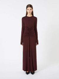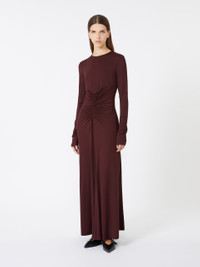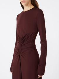 DETAILS Long dress with drawstring and gathered motif at the centre front. Stretch viscose jersey dress Fitted lines, flared at the hem Crew neck Long set-in sleeves Back concealed zip fastening Drawstring with custom metal ends Viscose jersey lining COMPOSITION AND CARE Jersey fabric 96% viscose, 4% elastane; lining 96% viscose, 4% elastane. Hand wash cold (40°c max); do not bleach; do not tumble dry; drip line drying in the shade; cool iron; professionally dry clean perchloroethylene - mild process; do not wet clean.; iron with a cloth between.; using neutral detergent.; don’t rub.; turn the articles inside out before washing.; to be ironed on reverse. Distributed by Max Mara S.r.l., registered office in Reggio Emilia (Italy), Via Giulia Maramotti 4, 42124 (IT)