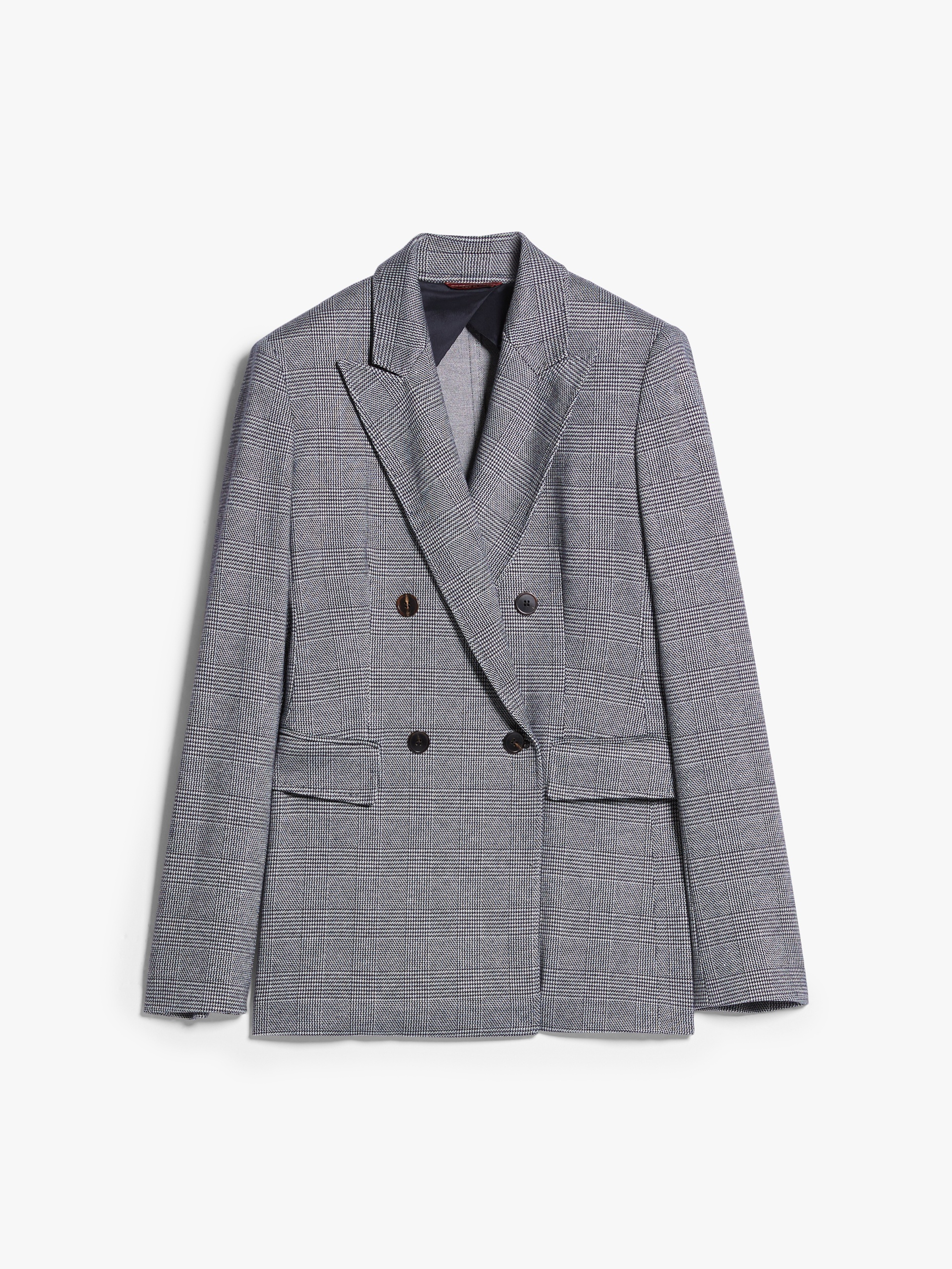 DETAILS Glen plaid-patterned double-breasted blazer in cotton-blend jacquard jersey fabric. Visible button fastening. Lapel collar, long sleeves and flap pockets. COMPOSITION AND CARE Jersey fabric 45% viscose, 44% cotton, 9% nylon, 2% elastane; lining 70% acetate, 30% polyester. Do not wash; do not bleach; do not tumble dry; cool iron; professionally dry clean perchloroethylene - mild process; do not wet clean.; do not iron the buttons.; protect buttons before washing.; contains non-textile parts of animal origin. Distributed by Max Mara S.r.l., registered office in Reggio Emilia (Italy), Via Giulia Maramotti 4, 42124 (IT)