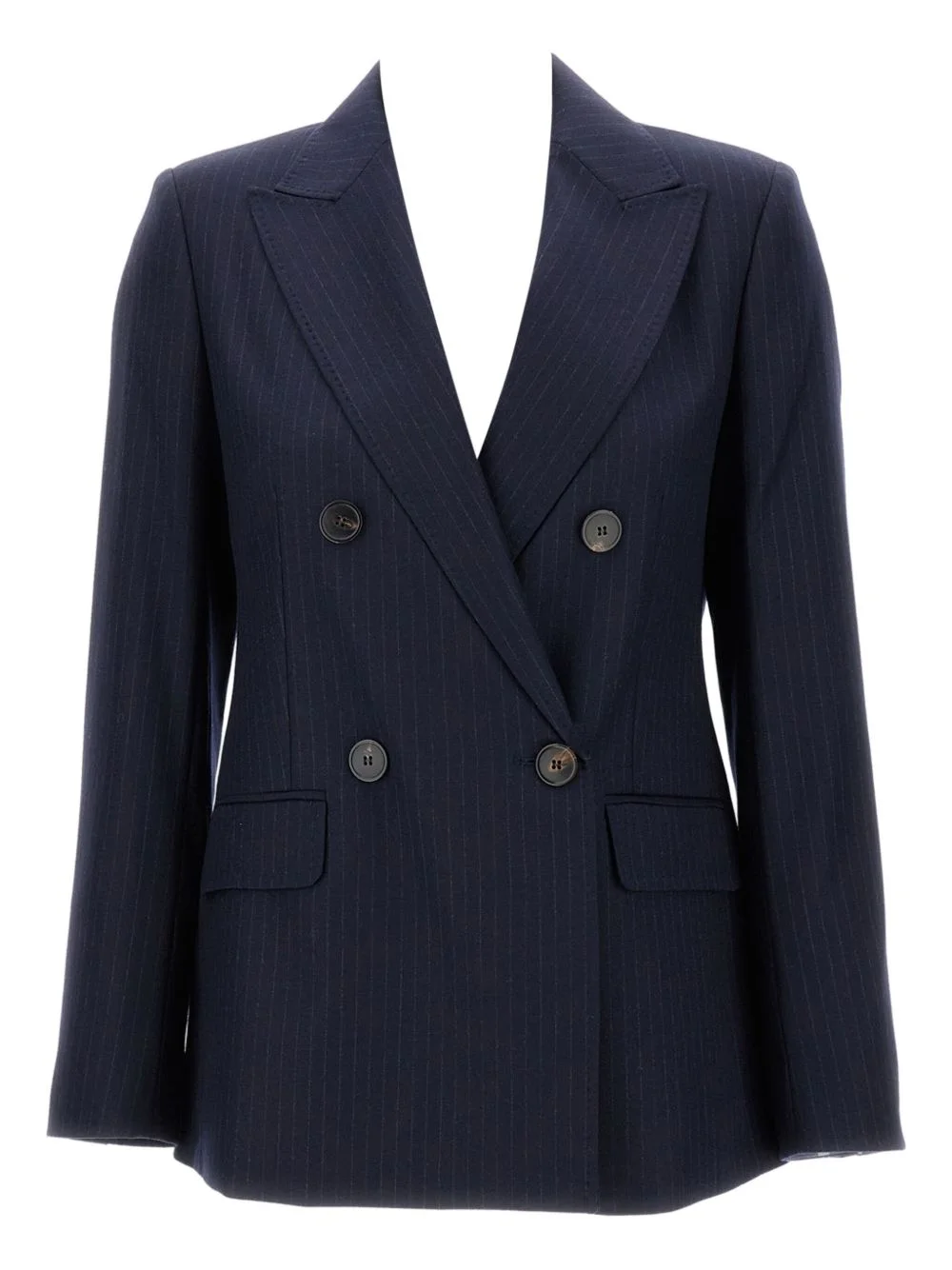pinstripe double-breasted jacket Highlights - Navy blue - Pinstripe - Double-breasted - Button fastening - Flap pockets - Buttoned cuffs Imported Composition Virgin Wool 99%, Spandex/Elastane 1% Washing instructions Read Manufacturer Guidelines
