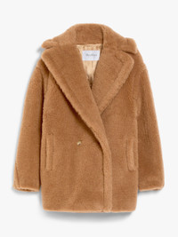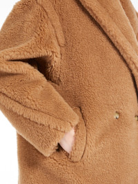 DETAILS Iconic Teddy coat in alpaca and wool on a silk base, available in a new short, above-the-knee length version. The classic style’s oversized fit and details are repeated: large lapel collar, low-set sleeves and vertical welt pockets. Double-breasted style, closed with visible buttons. COMPOSITION AND CARE Jersey fabric 88% camelwool, 12% silk; lining 100% viscose. Do not wash; do not bleach; do not tumble dry; do not iron; professionally dry clean perchloroethylene - mild process; do not wet clean.; protect buttons before washing.; contains non-textile parts of animal origin. Distributed by Max Mara S.r.l., registered office in Reggio Emilia (Italy), Via Giulia Maramotti 4, 42124 (IT)