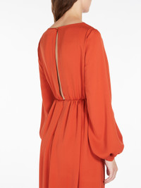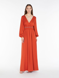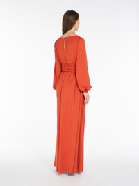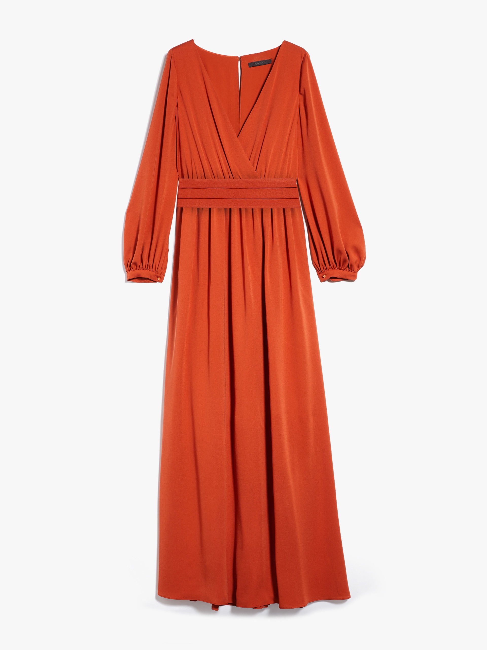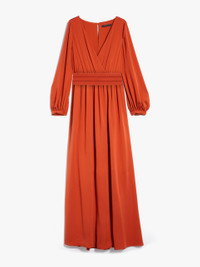 DETAILS Long tuxedo dress in luxurious pure silk charmeuse. The silhouette features soft draping with a cross-over neckline and wide volume with long slightly balloon sleeves. Finished with a seam at the waist and classic faille cummerbund in the same tones. Length: 160 cm. COMPOSITION AND CARE Fabric 100% silk; lining 85% acetate, 10% silk, 5% nylon. Do not wash; do not bleach; do not tumble dry; cool iron; professionally dry clean perchloroethylene - mild process; do not wet clean. Distributed by Max Mara S.r.l., registered office in Reggio Emilia (Italy), Via Giulia Maramotti 4, 42124 (IT)