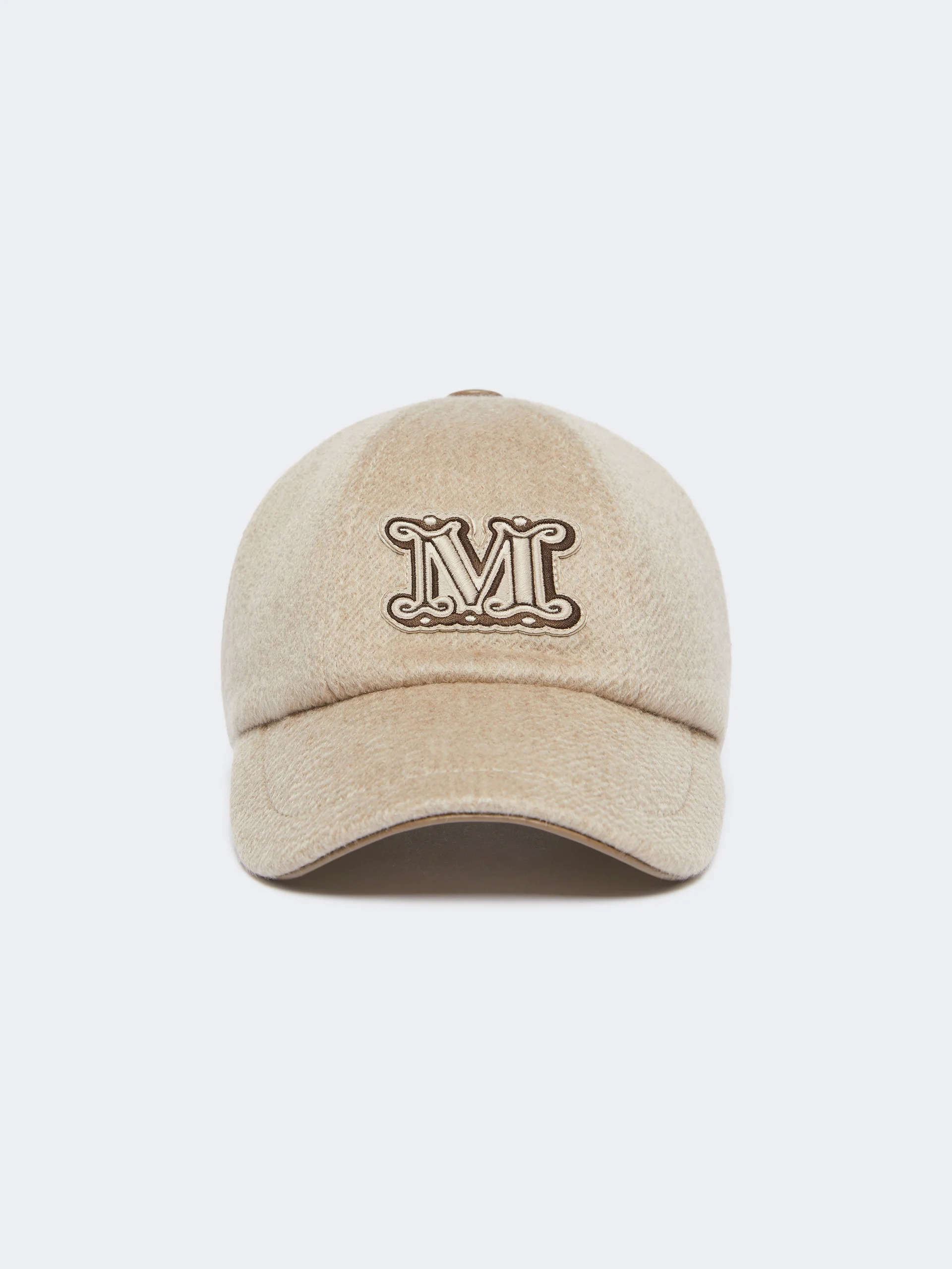 DETAILS Baseball cap with a semi-rigid peak. Hat in double-faced sable-look pure cashmere broadcloth Embroidered M Monogram logo on the front Metal buckle-adjustable strap at the back COMPOSITION AND CARE Fabric 100% cashmere; with details in 100% polyester; lining 100% viscose; swearband 100% viscose. Do not wash; do not bleach; do not tumble dry; do not iron; do not dry clean; do not wet clean.; contains non-textile parts of animal origin. Distributed by Max Mara S.r.l., registered office in Reggio Emilia (Italy), Via Giulia Maramotti 4, 42124 (IT)