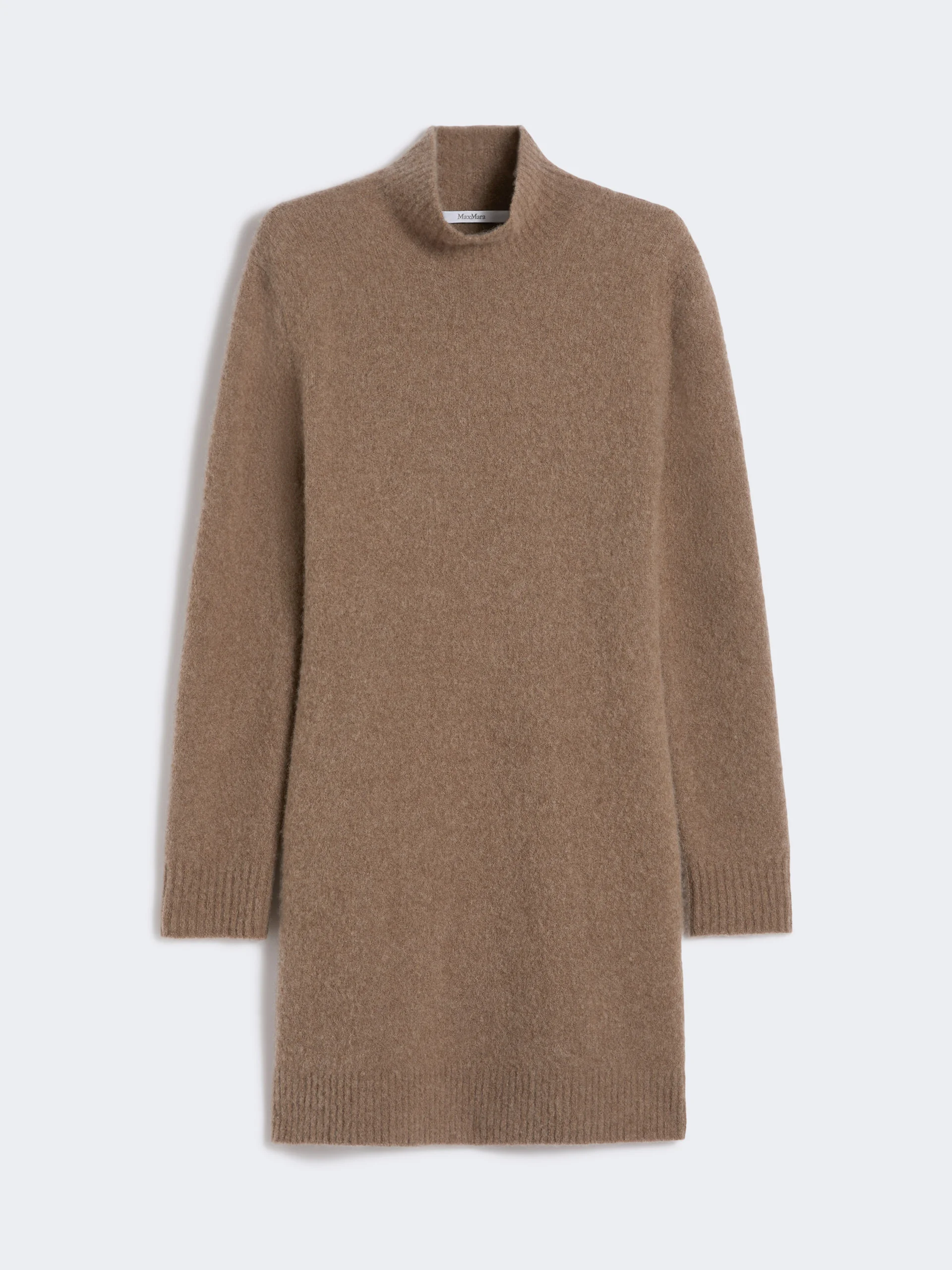 DETAILS Short dress with a fitted silhouette. Stretch cashmere yarn dress High neck Long set-in sleeves Ribbed trim Unlined COMPOSITION AND CARE 76% cashmere, 21% polyamide, 3% elastane. Hand wash cold (40°c max); do not bleach; do not tumble dry; flat drying in the shade; cool iron; professionally dry clean perchloroethylene - mild process; do not wet clean.; iron with a cloth between.; using neutral detergent. Distributed by Max Mara S.r.l., registered office in Reggio Emilia (Italy), Via Giulia Maramotti 4, 42124 (IT)