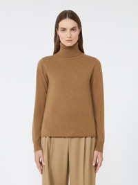 DETAILS Turtleneck sweater crafted from a wool and cashmere blend, featuring a high fold-over collar. Its special knit structure ensures balanced proportions without compromising comfort. Wool and cashmere yarn turtleneck sweater Regular fit Fold-down rib-knit high neck Long set-in sleeves Rib-knit cuffs and hem Straight hem COMPOSITION AND CARE 80% wool, 20% cashmere. Hand wash cold (40°c max); do not bleach; do not tumble dry; flat drying in the shade; cool iron; professionally dry clean perchloroethylene - mild process; do not wet clean.; iron with a cloth between.; using neutral detergent. Distributed by Max Mara S.r.l., registered office in Reggio Emilia (Italy), Via Giulia Maramotti 4, 42124 (IT)