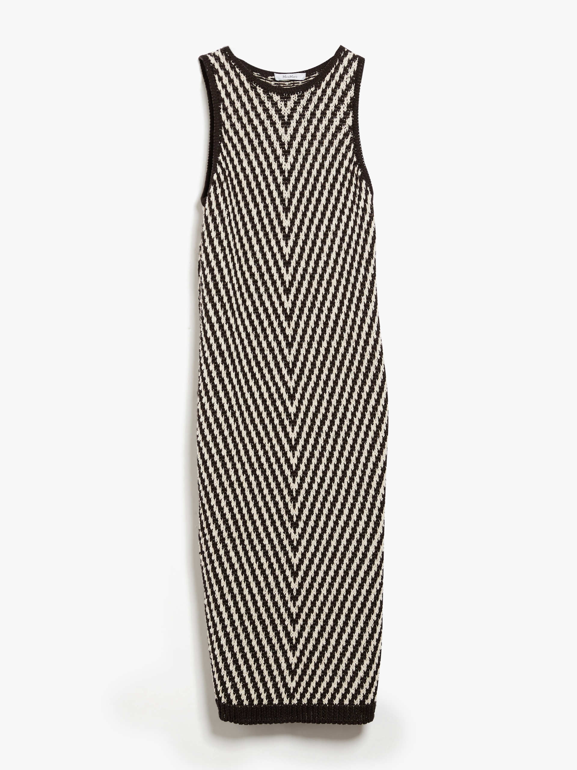 DETAILS Straight-cut sleeveless tunic made from fine linen, cotton and silk yarn, worked all over with an elegant chevron motif. Finished with wide side slits at the hem contrast edging. Length: 106 cm. COMPOSITION AND CARE Knitted fabric 57% flaxlinen, 24% cotton, 19% silk; hems 100% flaxlinen. Hand wash cold; do not bleach; do not tumble dry; flat drying in the shade; cool iron; professionally dry clean perchloroethylene - mild process; do not wet clean.; iron with a cloth between.; using neutral detergent. Distributed by Max Mara S.r.l., registered office in Reggio Emilia (Italy), Via Giulia Maramotti 4, 42124 (IT)