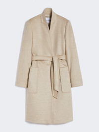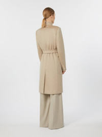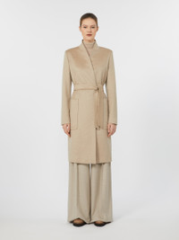 DETAILS Midi coat with a robe silhouette. Lightweight, pure cashmere drap coat Straight lines and central slit at the back Mandarin collar and set-in sleeves with side buttons Matching belt fastening Large patch pockets at the front Embellished with tailored pick stitch Lined in Monogram jacquard fabric COMPOSITION AND CARE Fabric 100% cashmere; lining 100% viscose. Do not wash; do not bleach; do not tumble dry; cool iron; professionally dry clean perchloroethylene - mild process; do not wet clean.; do not iron the buttons.; protect buttons before washing.; contains non-textile parts of animal origin. Distributed by Max Mara S.r.l., registered office in Reggio Emilia (Italy), Via Giulia Maramotti 4, 42124 (IT)