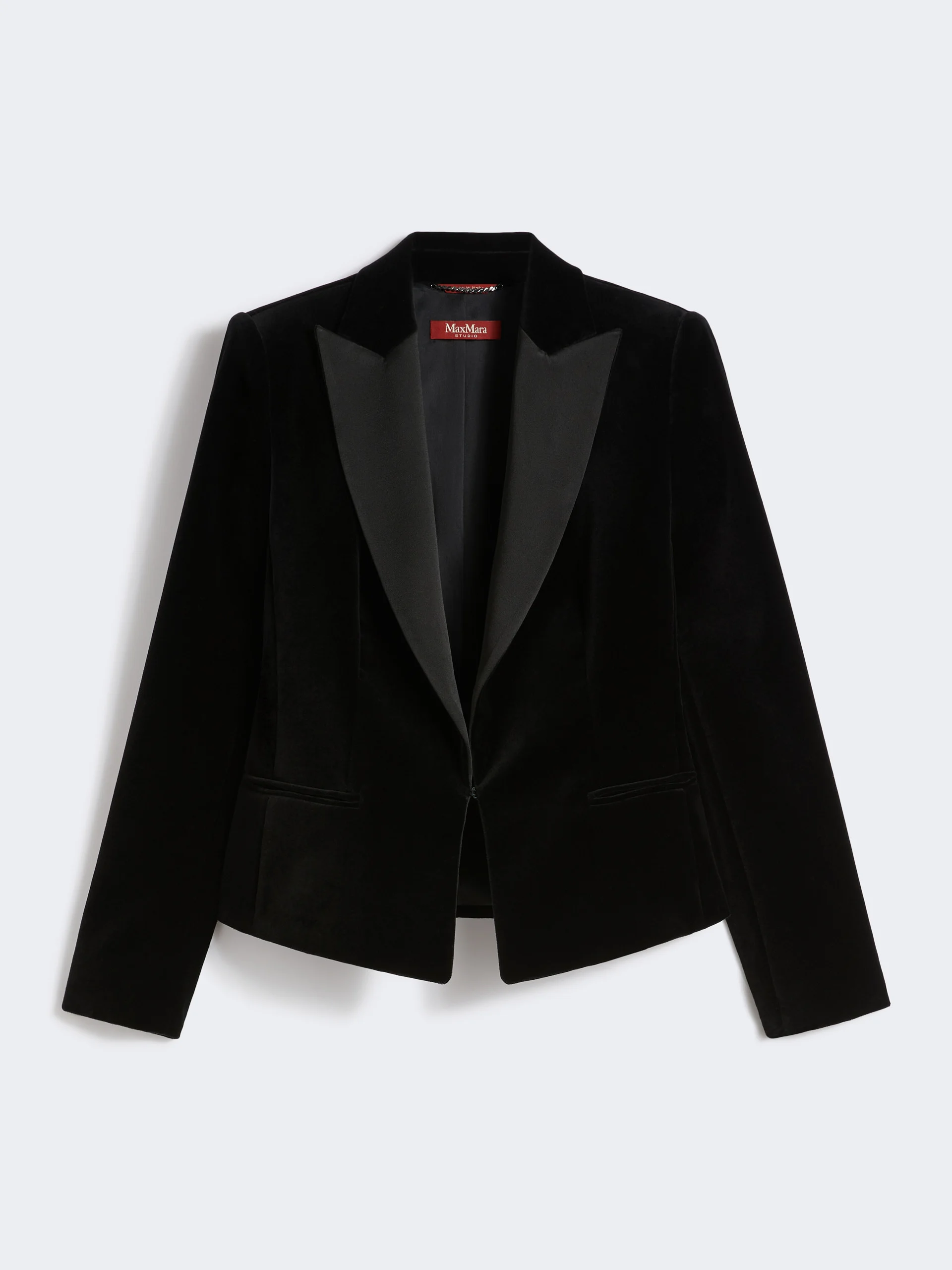 DETAILS Women's cropped jacket, designed in a sophisticated tuxedo style. The tailored construction shapes a feminine silhouette through meticulous craftsmanship and high-quality finishes. Jacket in smooth stretch cotton velvet Tailored, fitted silhouette Peak-lapel collar with enver satin detailing Set-in sleeves with covered buttons at the hems Horizontal welt pockets on front Fully lined model COMPOSITION AND CARE Fabric 98% cotton, 2% elastane; fabric 2 71% acetate, 29% viscose; lining 70% acetate, 30% polyester. Do not wash; do not bleach; do not tumble dry; cool iron; professionally dry clean perchloroethylene - mild process; do not wet clean. Distributed by Max Mara S.r.l., registered office in Reggio Emilia (Italy), Via Giulia Maramotti 4, 42124 (IT)