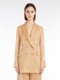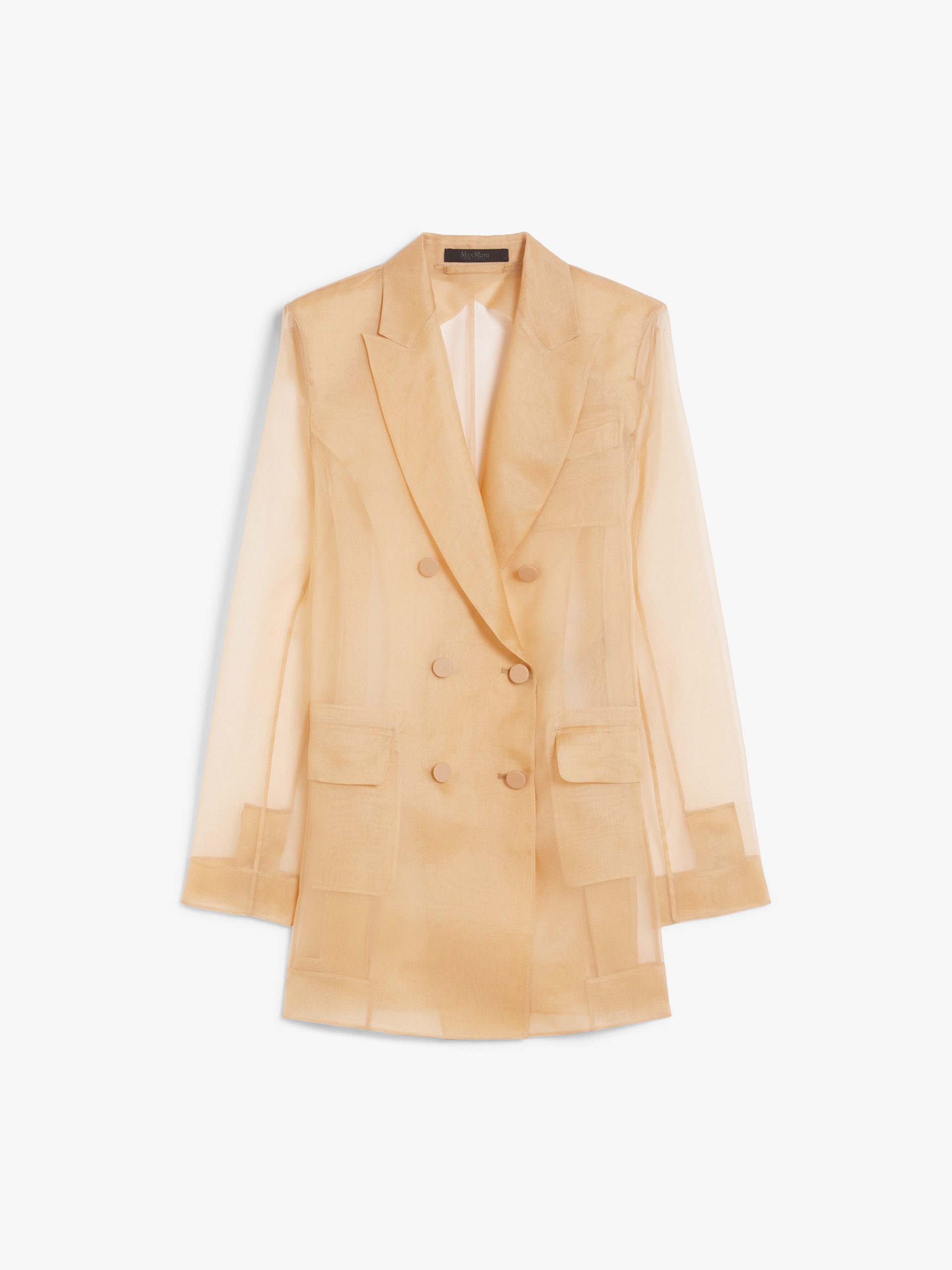 DETAILS Double-breasted jacket in extremely lightweight, luxurious pure silk organza. Straight-cut, unlined style with peak lapels, long set-in sleeves, a breast pocket and front patch pockets with flaps. Finished with a central double vent at the back. Fastened with matching-coloured buttons. COMPOSITION AND CARE 100% silk. Do not wash; do not bleach; do not tumble dry; cool iron; professionally dry clean perchloroethylene - mild process; do not wet clean.; wash the garment while it is fastened.; do not iron the buttons.; protect buttons before washing.; turn the articles inside out before washing. Distributed by Max Mara S.r.l., registered office in Reggio Emilia (Italy), Via Giulia Maramotti 4, 42124 (IT)