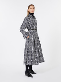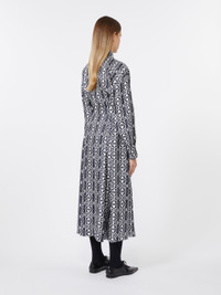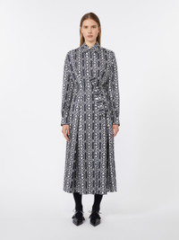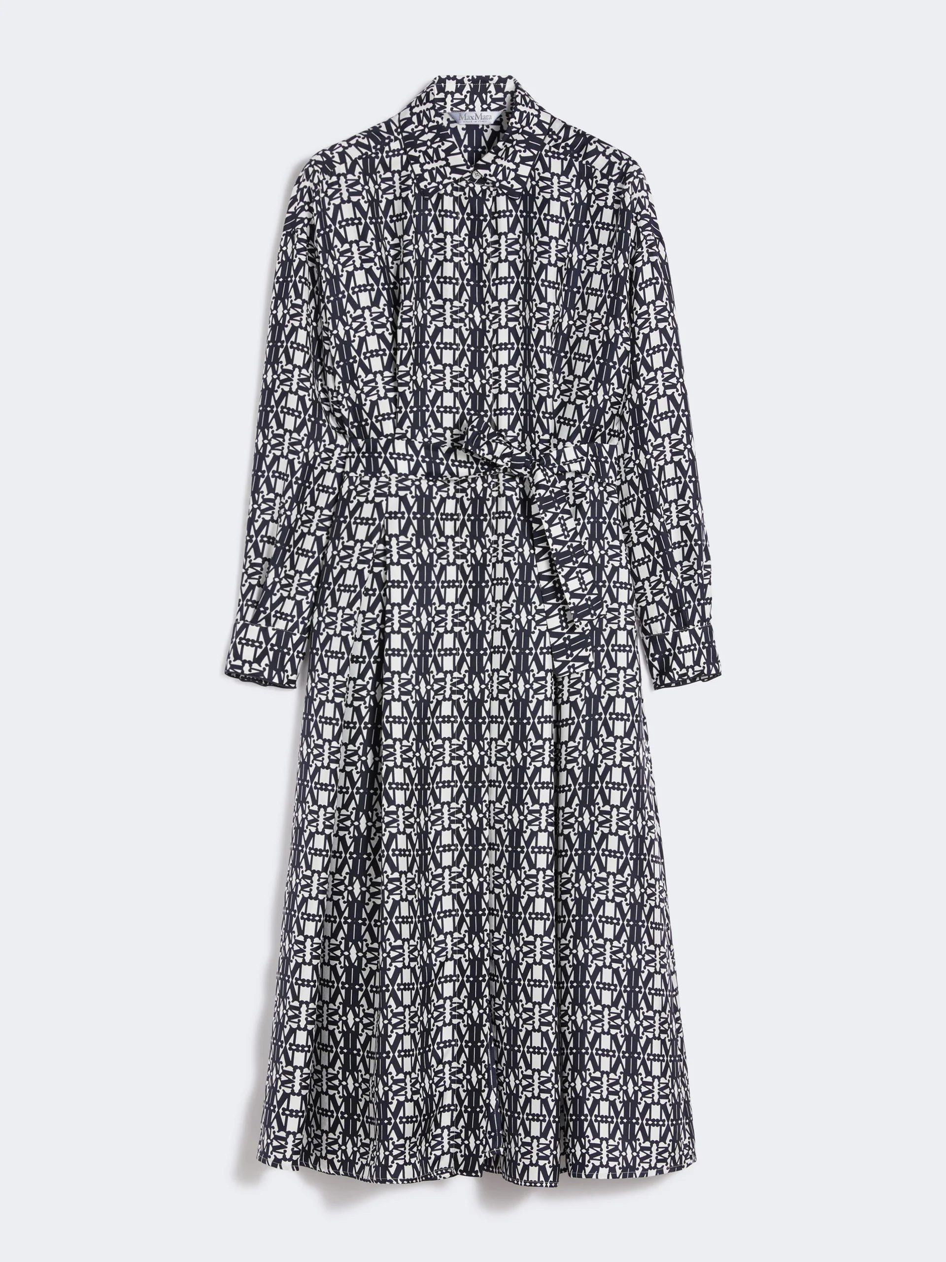 DETAILS Long shirt dress with large darts at the waist and pleats that give volume. Pure silk twill dress with Monogram print Flared lines with matching belt at the waist Shirt collar and cuffs Long sleeves with dropped shoulders Concealed front fastening that runs the length of the garment Side inset pockets Unlined COMPOSITION AND CARE Fabric 100% silk; - exclusive of decoration. Do not wash; do not bleach; do not tumble dry; cool iron; professionally dry clean perchloroethylene - mild process; do not wet clean.; wash the garment while it is fastened.; do not iron the buttons.; protect buttons before washing.; turn the articles inside out before washing. Distributed by Max Mara S.r.l., registered office in Reggio Emilia (Italy), Via Giulia Maramotti 4, 42124 (IT)
