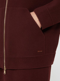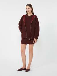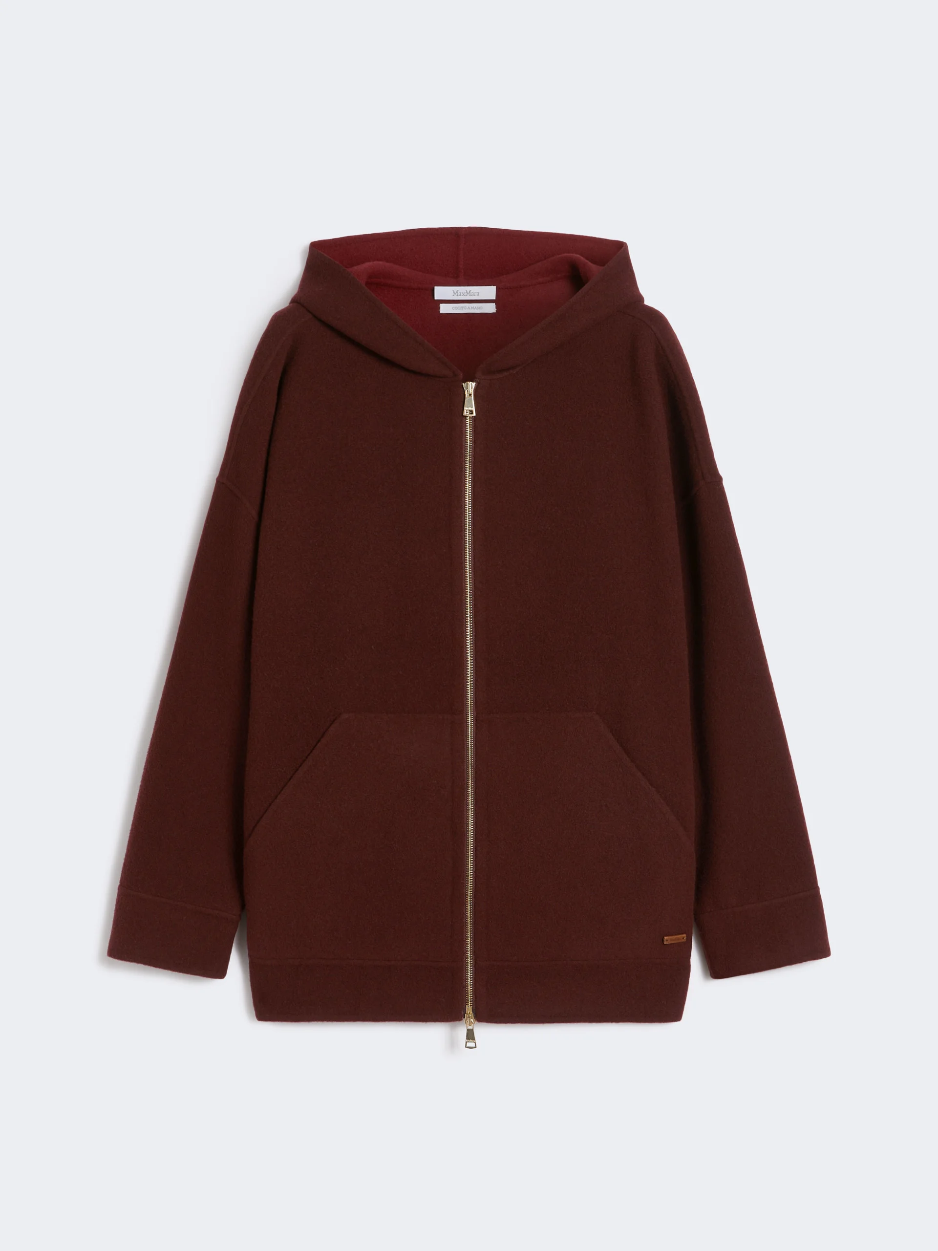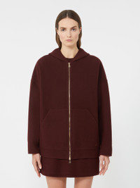 DETAILS Hooded sweatshirt in an oversized fit. Hand-sewn, double cashmere and wool jersey sweatshirt. Long sleeves with dropped shoulders Metal zip fastening on the front Pouch pockets on the front Logo plate on the bottom of the left pocket COMPOSITION AND CARE Jersey fabric 85% virgin wool, 10% cashmere, 5% polyamide; - exclusive of decoration. Do not wash; do not bleach; do not tumble dry; cool iron; professionally dry clean perchloroethylene - mild process; do not wet clean.; iron with a cloth between. Distributed by Max Mara S.r.l., registered office in Reggio Emilia (Italy), Via Giulia Maramotti 4, 42124 (IT)