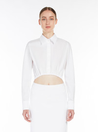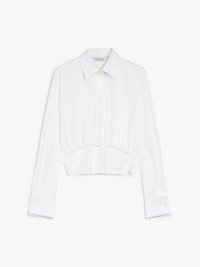 DETAILS Pure cotton poplin shirt featuring a cropped cut as the waist with a gathered motif at the front and a slightly longer square back. The style is completed by a classic pointed collar, long sleeves with high cufflink cuffs, a yoke cut and a pleat on the back. Concealed button fastening at the front. COMPOSITION AND CARE 100% cotton. Machine wash cold delicate cycle; do not bleach; do not tumble dry; line drying in the shade; cool iron; professionally dry clean perchloroethylene - mild process.; wash the garment while it is fastened.; do not iron the buttons.; turn the articles inside out before washing.; remove the cufflinks before washing.; contains non-textile parts of animal origin. Distributed by Max Mara S.r.l., registered office in Reggio Emilia (Italy), Via Giulia Maramotti 4, 42124 (IT)