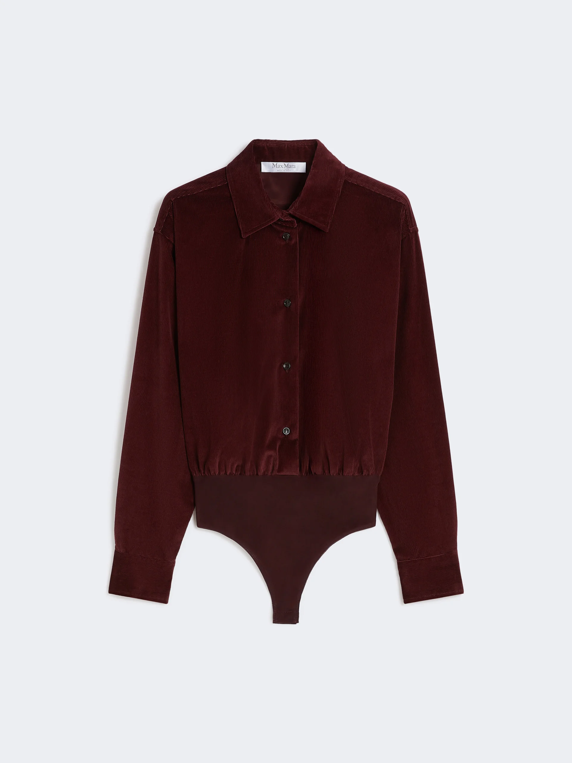 DETAILS Oversized shirt featuring a bodysuit construction with tone-on-tone tulle thong. Stretch cotton velvet bodysuit Loose fit Shirt collar and cuffs Long sleeves with dropped shoulders Front closure with buttons and snap buttons at the bottom Gathered waist seam Back yoke seam COMPOSITION AND CARE Fabric 98% cotton, 2% elastane; with knitted details 94% polyamide, 6% elastane. Do not wash; do not bleach; do not tumble dry; cool iron; professionally dry clean perchloroethylene - mild process; do not wet clean.; do not iron the buttons.; turn the articles inside out before washing.; contains non-textile parts of animal origin. Distributed by Max Mara S.r.l., registered office in Reggio Emilia (Italy), Via Giulia Maramotti 4, 42124 (IT)