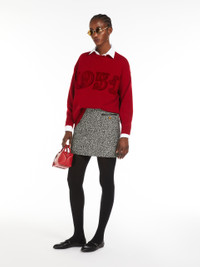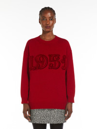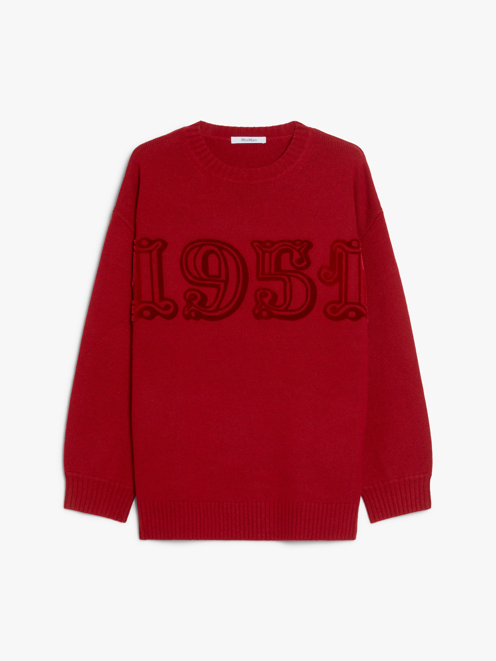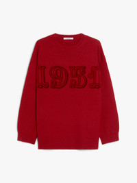 DETAILS Fine wool and cashmere stockinette yarn crew-neck jumper adorned with a flocked 1951 motif on the front. Slightly oversized volume garment in a stockinette knit, featuring long low-set sleeves and ribbed edges. COMPOSITION AND CARE Knitted fabric 70% wool, 30% cashmere; - exclusive of decoration. Do not wash; do not bleach; do not tumble dry; cool iron; professionally dry clean perchloroethylene - mild process; do not wet clean.; iron with a cloth between.; to be ironed with no steam.; do not iron the decoration. Distributed by Max Mara S.r.l., registered office in Reggio Emilia (Italy), Via Giulia Maramotti 4, 42124 (IT)