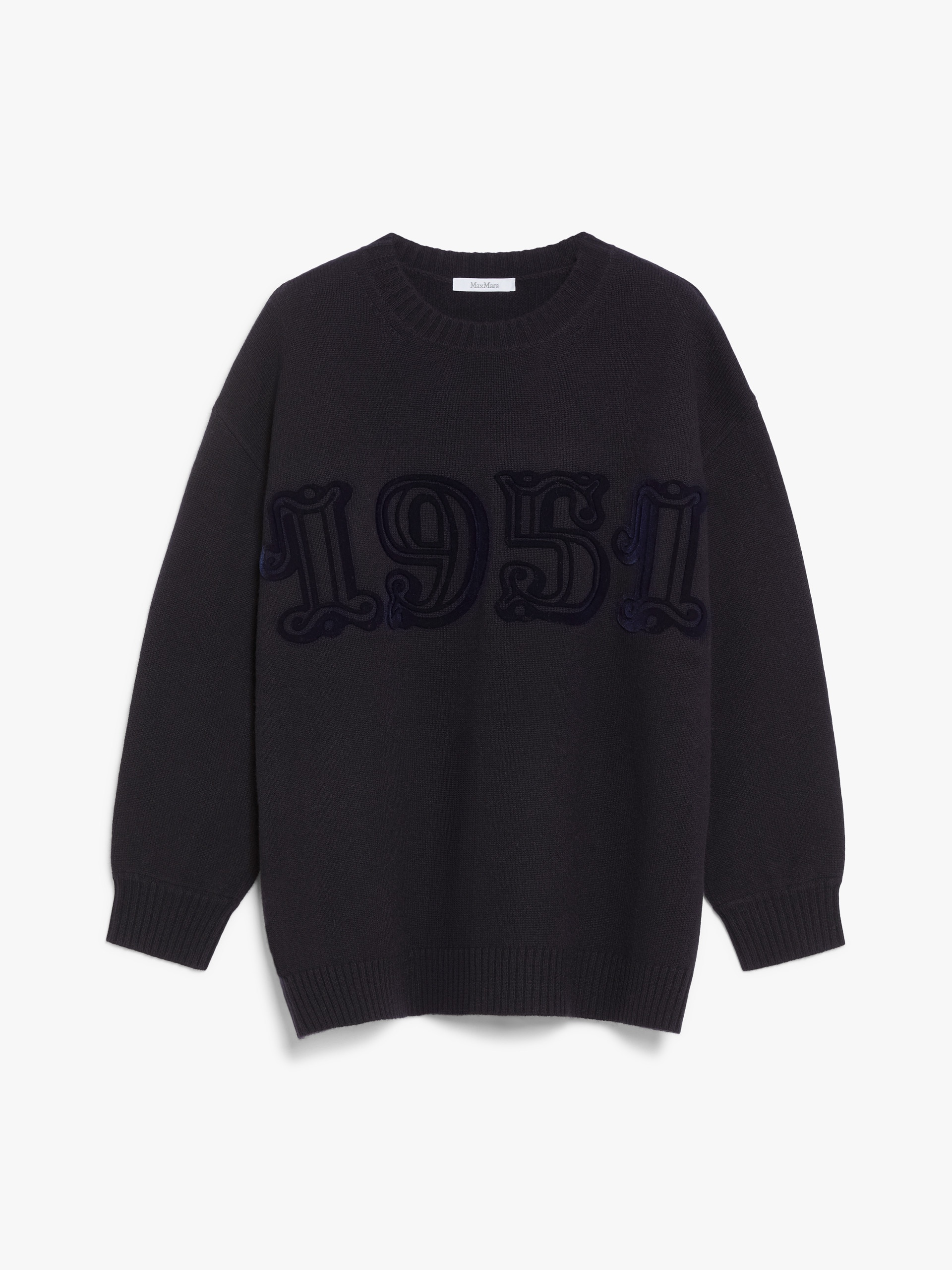 DETAILS Fine wool and cashmere stockinette yarn crew-neck jumper adorned with a flocked 1951 motif on the front. Slightly oversized volume garment in a stockinette knit, featuring long low-set sleeves and ribbed edges. COMPOSITION AND CARE Knitted fabric 70% wool, 30% cashmere; - exclusive of decoration. Do not wash; do not bleach; do not tumble dry; cool iron; professionally dry clean perchloroethylene - mild process; do not wet clean.; iron with a cloth between.; to be ironed with no steam.; do not iron the decoration. Distributed by Max Mara S.r.l., registered office in Reggio Emilia (Italy), Via Giulia Maramotti 4, 42124 (IT)