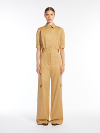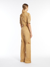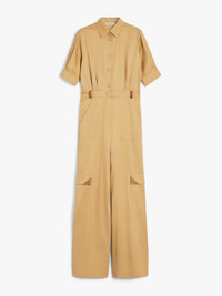 DETAILS Workwear-inspired jumpsuit made of pure cotton gabardine. The style features a classic shirt collar, elbow-length sleeves with cuffs and a side button, inset side pockets and patch pockets on the leg with a flap and leather detail. Finished with leather belt loops and a yoke at the back. Front fastening with visible buttons. COMPOSITION AND CARE Fabric 100% cotton; with details in buffalo. Do not wash; do not bleach; do not tumble dry; cool iron; professionally dry clean perchloroethylene - mild process; do not wet clean.; wash the garment while it is fastened.; do not wash or dry clean by fabric methods. clean only by leather and fur specialists.; do not iron the buttons.; protect buttons before washing.; turn the articles inside out before washing.; contains non-textile parts of animal origin. Distributed by Max Mara S.r.l., registered office in Reggio Emilia (Italy), Via Giulia Maramotti 4, 42124 (IT)