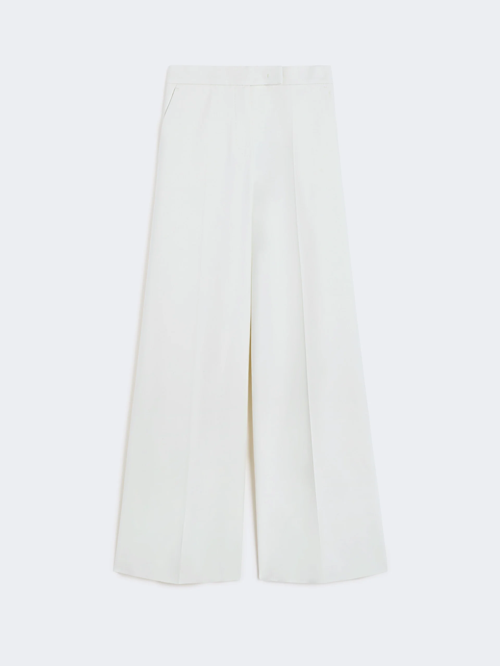 DETAILS Masculine-inspired wide-leg trousers with a slightly high waist. - Trousers in double stretch cotton canvas - Wide-leg fit - Fastening with a wide waistband tab, zip fly and small hook - Slant pockets at the sides - Trouser crease and darts sewn at the waist back COMPOSITION AND CARE 95% cotton, 5% elastane. Hand wash cold (40°c max); do not bleach; do not tumble dry; line drying in the shade; cool iron; professionally dry clean perchloroethylene - mild process; do not wet clean.; protect buttons before washing. Distributed by Max Mara S.r.l., registered office in Reggio Emilia (Italy), Via Giulia Maramotti 4, 42124 (IT)