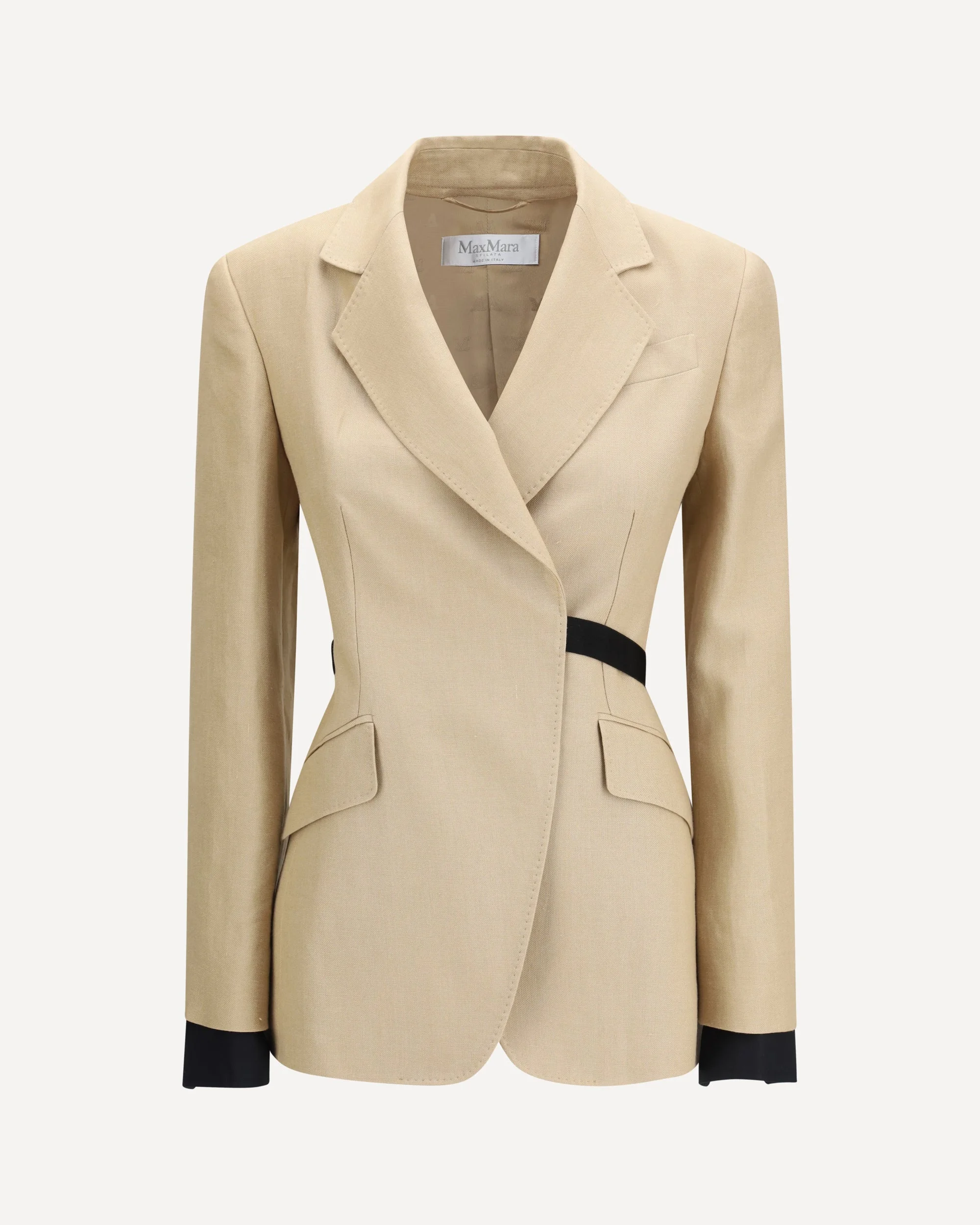 The Fionda Jacket by Max Mara stands out for a tailored construction that interprets classic tailoring with a contemporary accent. The Fionda model by Max Mara features a classic notched lapel with stitching that defines the line of the garment with precision. The elastic belt introduces a dynamic element that enhances the silhouette, while front flap pockets complete the design with a functional detail. On the back, the double vent allows ease of movement, while linen cuffs complete the Fionda jacket by Max Mara with a balance of structure and lightness. DETAILS - Sku: 2611041533600_003 - Season: SS26 - Fit: Regular - Composition: GENERAL 100% Linen - MADE IN ITALY
