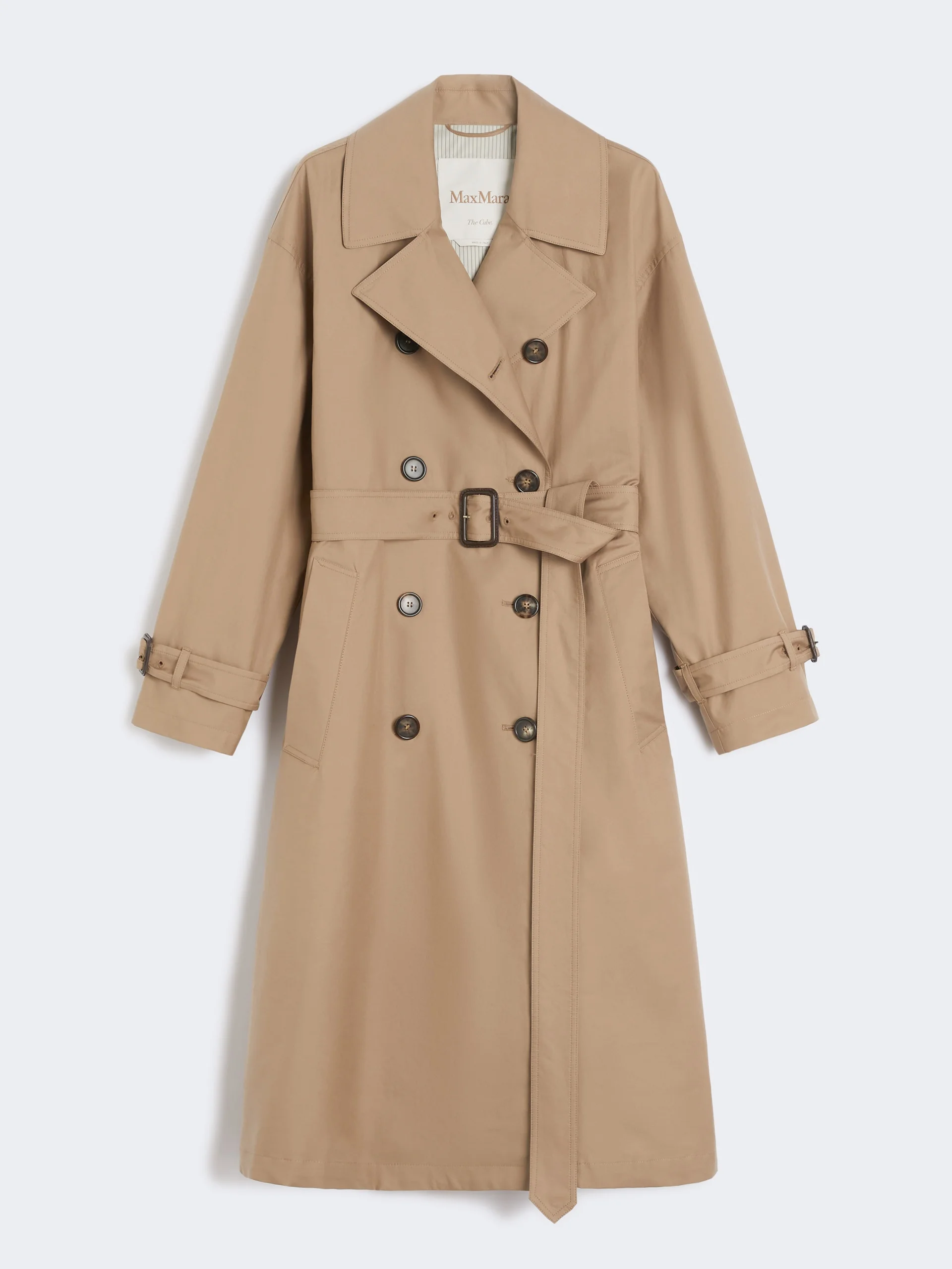 DETAILS Long trench coat with matching belt and iconic cuff straps. The main fabric contains at least 50% cotton fibre, grown according to organic farming standards Water-repellent cotton twill trench coat Large lapel collar with embossed logo on the back Long sleeves Double-breasted fastening with horn buttons Side welt pockets and deep central slit on the back Partially lined COMPOSITION AND CARE Fabric 69% cotton, 31% polyester; lining 100% polyester. Machine wash cold delicate cycle; do not bleach; do not tumble dry; line drying in the shade; cool iron; professionally dry clean perchloroethylene - mild process.; wash the garment while it is fastened.; don’t iron the labels.; do not iron the buttons.; protect buttons before washing.; turn the articles inside out before washing.; remove the buckle before washing.; contains non-textile parts of animal origin. Distributed by Max Mara S.r.l., registered office in Reggio Emilia (Italy), Via Giulia Maramotti 4, 42124 (IT)