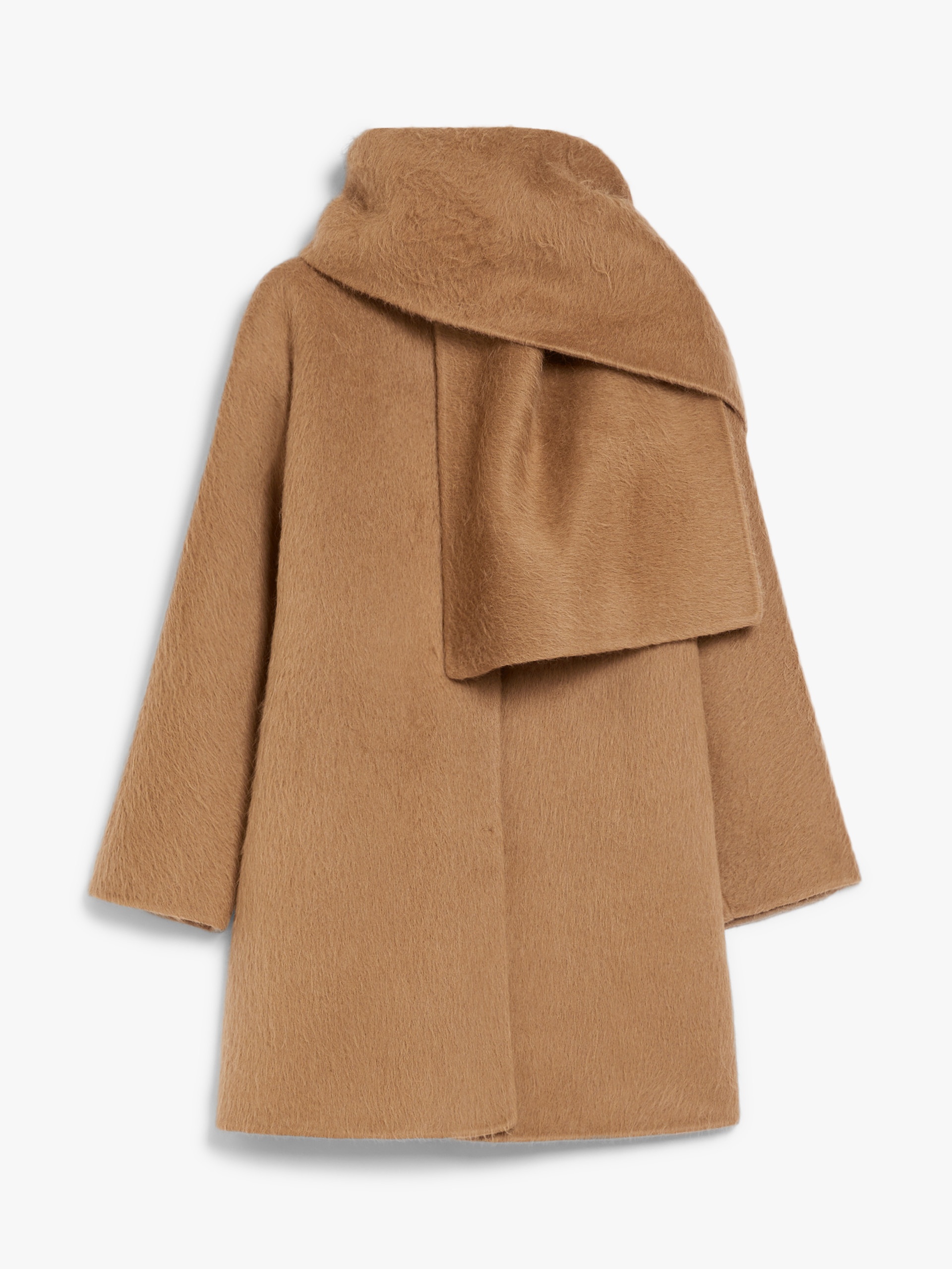 DETAILS Short jacket made of exquisite, soft, hand-stitched alpaca double fabric, with tone-on-tone wool interior. Crew-neck garment featuring a large, wraparound removable matching scarf and low set-in sleeves at the back with a kimono-style on the front. Features inset side pockets and a straight hem. Concealed button fastening. COMPOSITION AND CARE Fabric 68% virgin wool, 32% alpaca; fabric except joining thread. Do not wash; do not bleach; do not tumble dry; cool iron; professionally dry clean perchloroethylene - mild process; do not wet clean.; wash the garment while it is fastened.; turn the articles inside out before washing. Distributed by Max Mara S.r.l., registered office in Reggio Emilia (Italy), Via Giulia Maramotti 4, 42124 (IT)