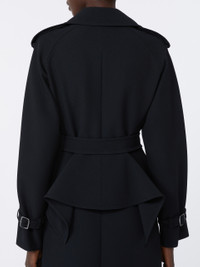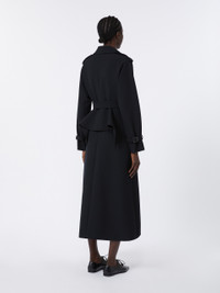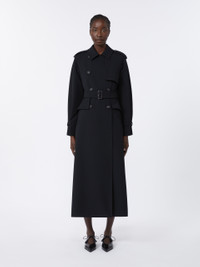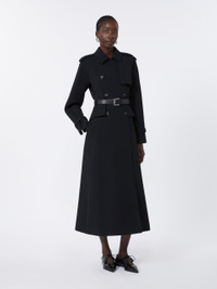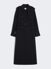 DETAILS Long, double-breasted trench coat. Flared style with iconic details. Trench coat in double-layer stretch sable Dual-use collar to wear open with lapels or closed with a button Long raglan sleeves with cuff straps and epaulettes on the shoulders Fastens with horn buttons and matching belt Applied flap pockets on the sides Flounce detail applied at the waist back and on the sides Partially lined COMPOSITION AND CARE Fabric 90% polyester, 10% elastane; lining 65% acetate, 35% polyester. Do not wash; do not bleach; do not tumble dry; cool iron; professionally dry clean perchloroethylene - mild process; do not wet clean.; wash the garment while it is fastened.; do not iron the buttons.; protect buttons before washing.; protect the buckle before washing.; turn the articles inside out before washing.; contains non-textile parts of animal origin. Distributed by Max Mara S.r.l., registered office in Reggio Emilia (Italy), Via Giulia Maramotti 4, 42124 (IT)