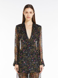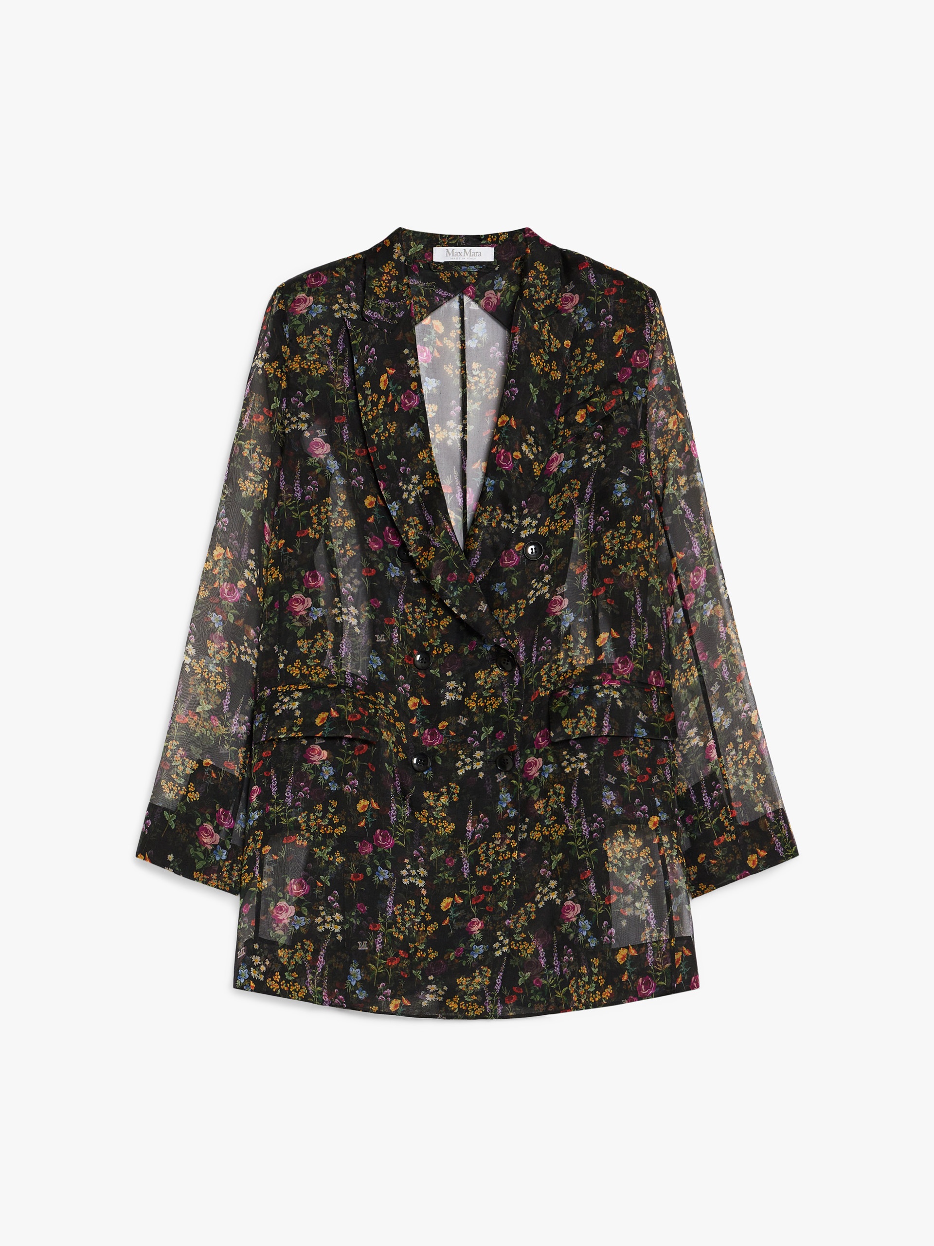DETAILS Elegant double-breasted jacket in lightweight, luxurious printed pure silk organza, with a delicate floral print consisting of a bouquet of seven different small flowers. Unlined style with a straight line, finished with tailored details: peak lapels, breast pocket, welt pockets with flap on the front and small side slits on the back. Button fastening. COMPOSITION AND CARE 100% silk. Do not wash; do not bleach; do not tumble dry; cool iron; professionally dry clean perchloroethylene - mild process; do not wet clean.; put this item into a string bag before washing it.; wash the garment while it is fastened. Distributed by Max Mara S.r.l., registered office in Reggio Emilia (Italy), Via Giulia Maramotti 4, 42124 (IT)