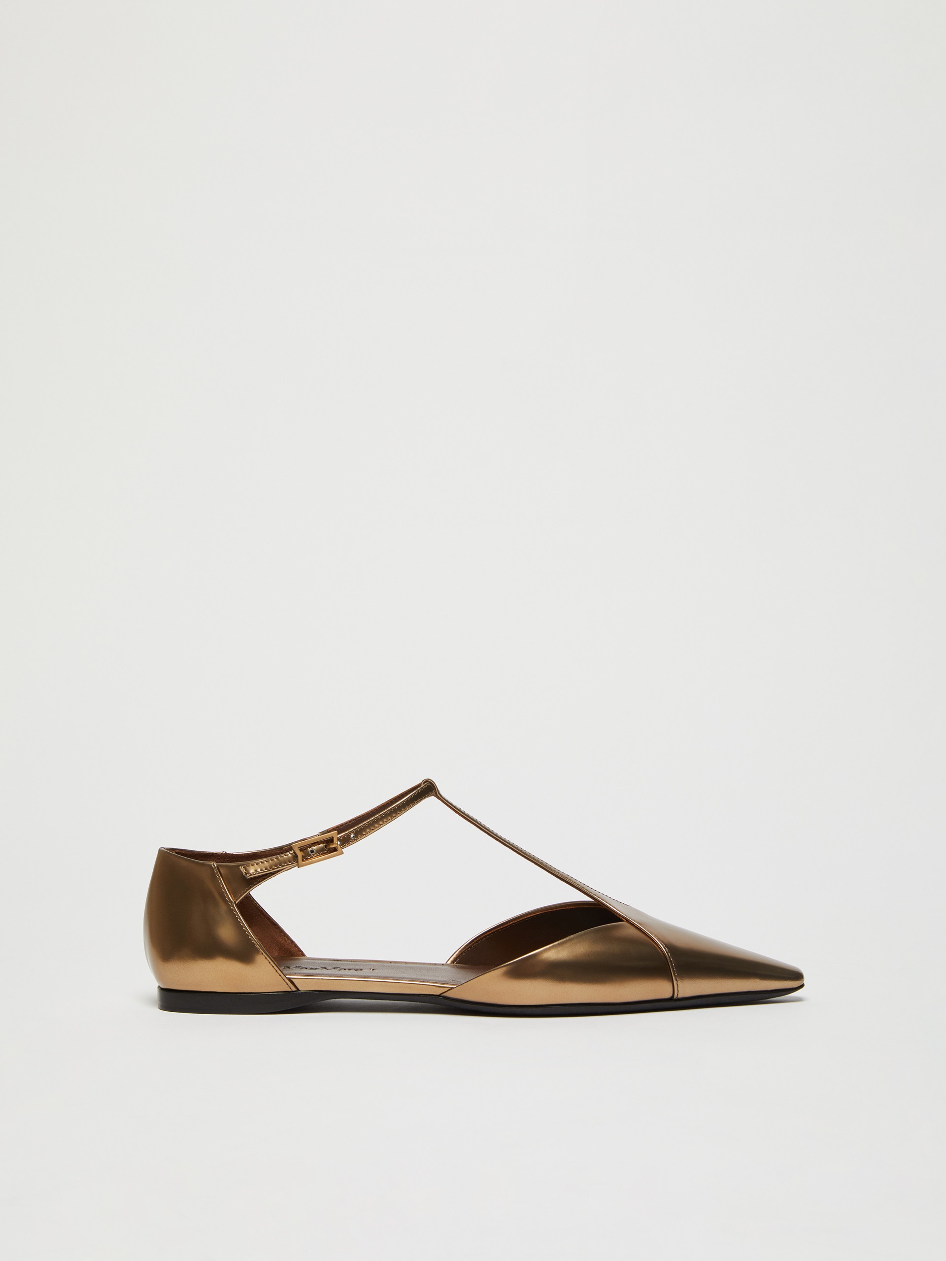DETAILS Ballet flats in soft metallic leather with a satin finish, featuring a pointed toe, covered heel, and T-bar strap on the instep that is adjustable at the ankle. Closure with small side buckle with metallic double M logo. Leather lining and insole, black pumice leather sole with 1-cm wedge heel. COMPOSITION AND CARE Upper in calf; lining in lamb leather; sole in leather. Distributed by Max Mara S.r.l., registered office in Reggio Emilia (Italy), Via Giulia Maramotti 4, 42124 (IT)