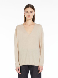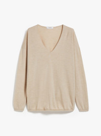 DETAILS Jumper with plunge V-neck in lightweight and luxurious pure cashmere yarn. Slightly oversize volume style in a stockinette-stitch knit, completed by long low-set sleeves and ribbed edges. COMPOSITION AND CARE 100% cashmere. Hand wash cold; do not bleach; do not tumble dry; flat drying in the shade; cool iron; professionally dry clean perchloroethylene - mild process; do not wet clean.; iron with a cloth between.; using neutral detergent. Distributed by Max Mara S.r.l., registered office in Reggio Emilia (Italy), Via Giulia Maramotti 4, 42124 (IT)