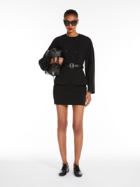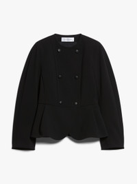 DETAILS Feminine double-breasted jacket, made of a stretch fabric. Crew-neck garment featuring a structured silhouette, with long kimono sleeves, waist seam and peplum on the hips. Lined in customised fabric and fastened with matching metallic satin-finish buttons. COMPOSITION AND CARE Fabric 89% polyester, 11% elastane; lining 65% acetate, 35% polyester. Do not wash; do not bleach; do not tumble dry; cool iron; professionally dry clean perchloroethylene - mild process; do not wet clean.; wash the garment while it is fastened.; do not iron the buttons.; protect buttons before washing.; turn the articles inside out before washing. Distributed by Max Mara S.r.l., registered office in Reggio Emilia (Italy), Via Giulia Maramotti 4, 42124 (IT)