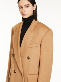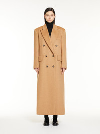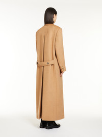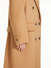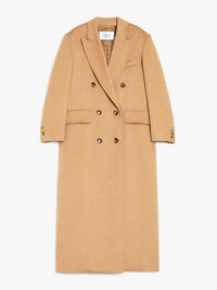 DETAILS Long double-breasted coat made from hand-sewn, luxurious pure camel hair drap double cloth. The silhouette features a deep reverse pleat on the back, buttons and martingale at the waist. Lined style with peak lapels, breast pocket and flap pockets on the front. The set-in sleeves feature buttons at the cuffs. Visible button fastening. COMPOSITION AND CARE Fabric 100% camelwool; - except joining thread; lining 100% viscose. Do not wash; do not bleach; do not tumble dry; cool iron; professionally dry clean perchloroethylene - mild process; do not wet clean.; do not iron the buttons.; protect buttons before washing.; contains non-textile parts of animal origin. Distributed by Max Mara S.r.l., registered office in Reggio Emilia (Italy), Via Giulia Maramotti 4, 42124 (IT)