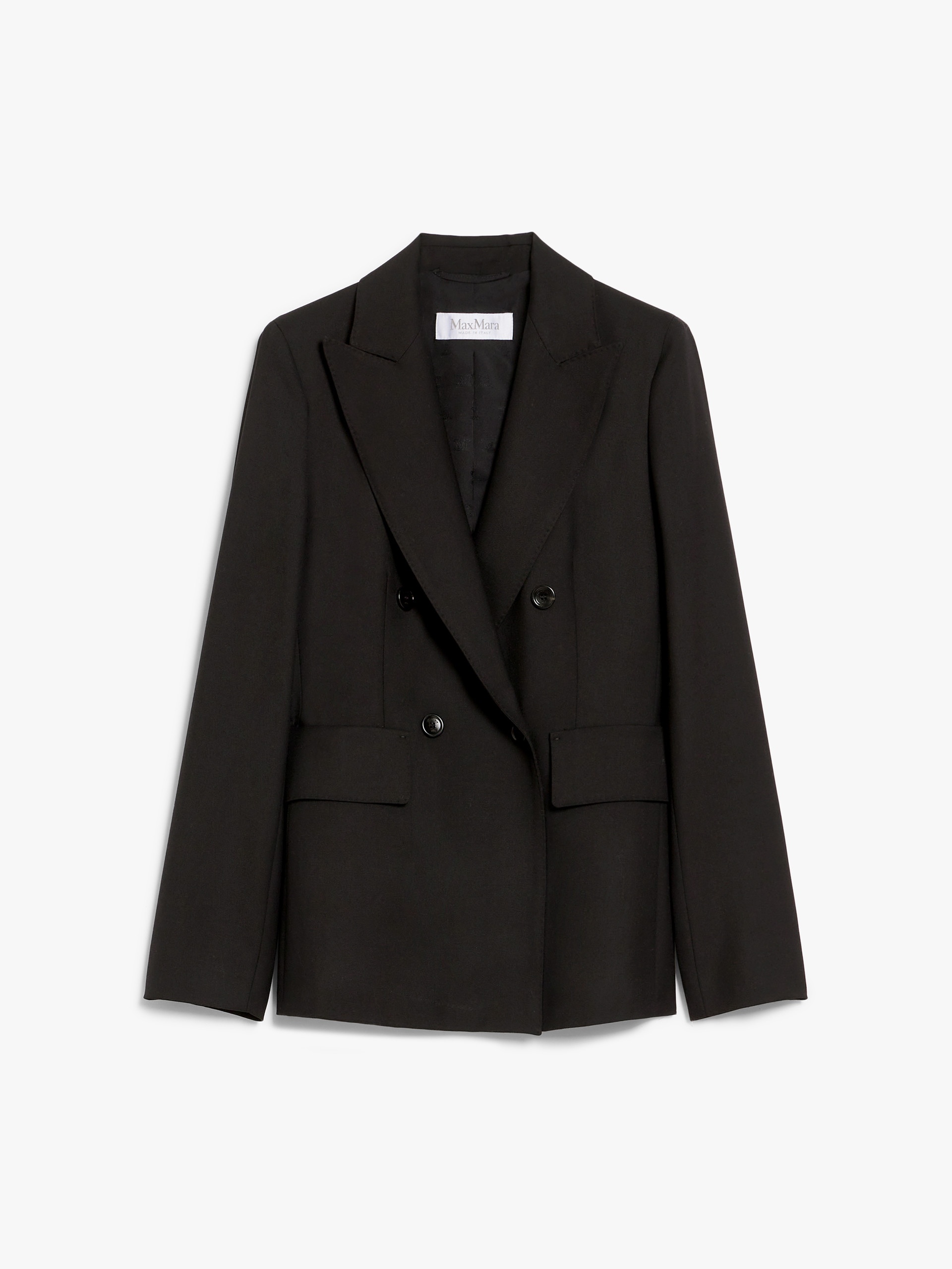 DETAILS Double-breasted blazer made of luxurious gabardine wool. Semi-fitted silhouette with a peak lapel collar, welt pockets with flap applied on the front and set-in sleeves with buttons on the cuffs. Lined in customised fabric with a central vent on the back and front fastening with visible buttons. COMPOSITION AND CARE Fabric 100% virgin wool; lining 65% acetate, 35% polyester. Do not wash; do not bleach; do not tumble dry; cool iron; professionally dry clean perchloroethylene - mild process; do not wet clean.; wash the garment while it is fastened.; do not iron the buttons.; protect buttons before washing.; turn the articles inside out before washing.; contains non-textile parts of animal origin. Distributed by Max Mara S.r.l., registered office in Reggio Emilia (Italy), Via Giulia Maramotti 4, 42124 (IT)