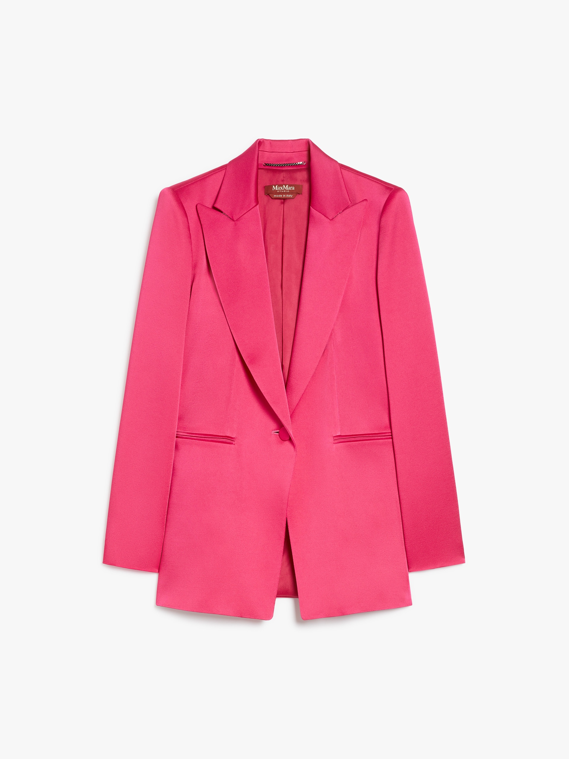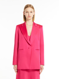 DETAILS Tailored single-breasted blazer made of elegant shiny envers satin with a washed texture. Lined style with peak lapel collar, long, set-in sleeves with buttoned cuffs and double-welt pockets on the front. Finished with a centre-back slit and fastened with a single button. COMPOSITION AND CARE Fabric 71% acetate, 29% viscose; lining 70% acetate, 30% polyester. Do not wash; do not bleach; do not tumble dry; cool iron; professionally dry clean perchloroethylene - mild process; do not wet clean. Distributed by Max Mara S.r.l., registered office in Reggio Emilia (Italy), Via Giulia Maramotti 4, 42124 (IT)